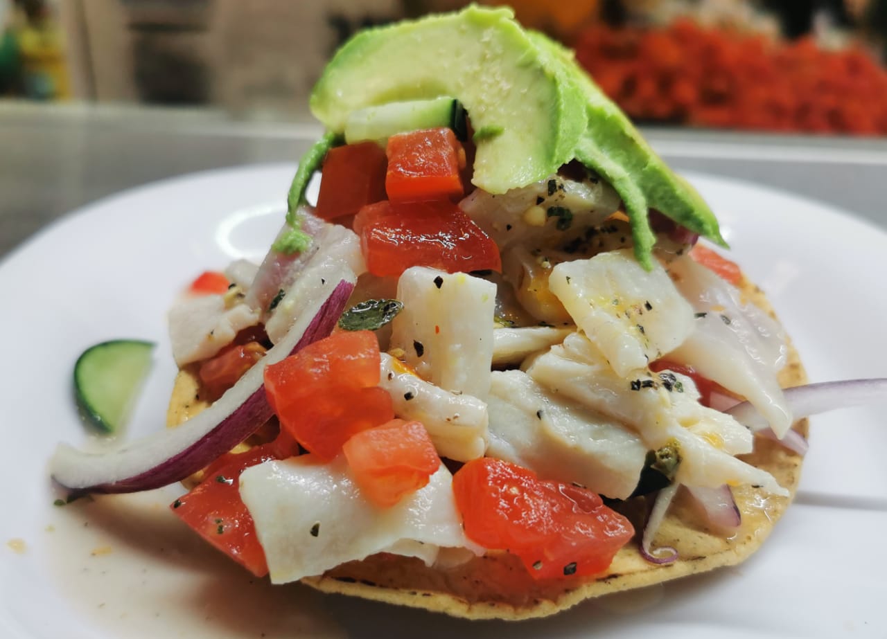 Pescado crudo cocido en limón, pico de gallo y aguacate.