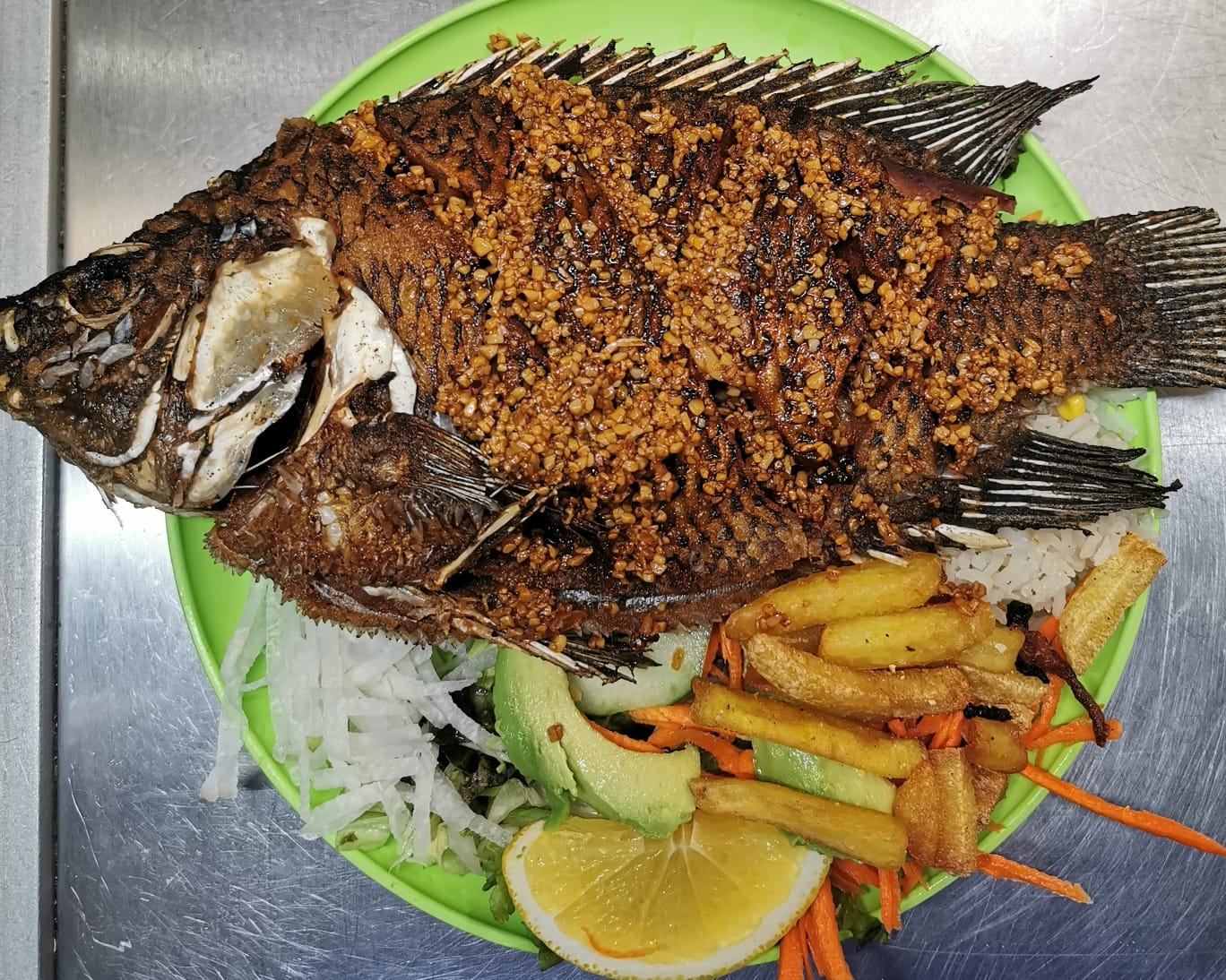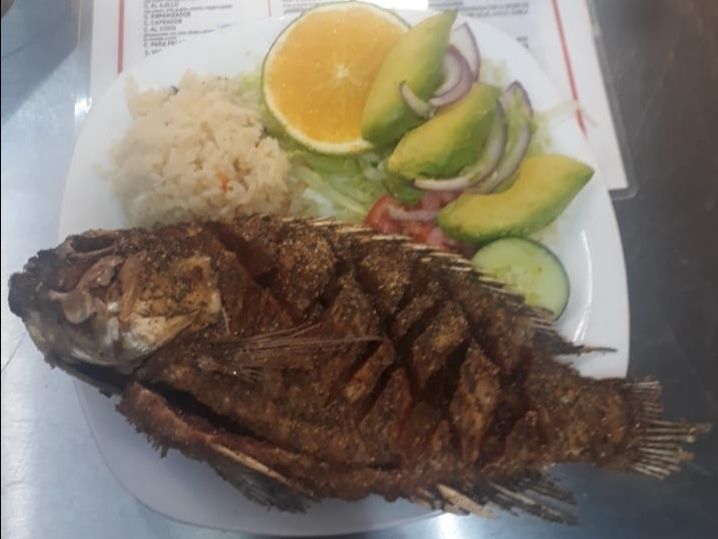 160 g. de Filete de Mojarra : Salsa de la casa, chile habanero y árbol, muy picosa. Guarnición: Arroz, papa natural y ensalada.