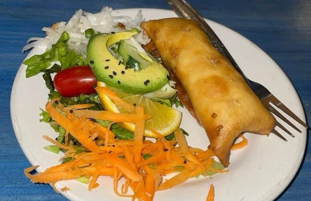 Tortilla de maíz con queso y ceviche guisado frita. Acompañada de ensalada.