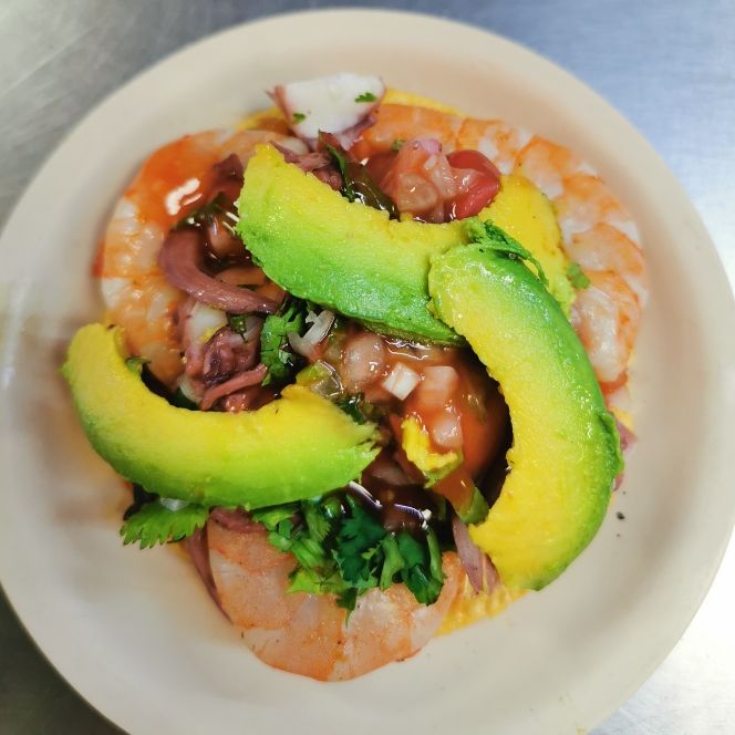 80-90 g de Proteína. Especifica en comentarios marisco de tu elección: camarón, pulpo, ostión, calamar, caracol, surimi, sabana de calamar o vuelve a la vida. ¡¡Tú eliges!! Cilantro, cebolla y aguacate.
