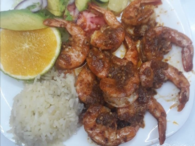 5 Camarones c/Cabeza talla 20/30 (180-190 g): Salsa de la casa, chile habanero y árbol, muy picante. Guarnición: Arroz, papa natural y ensalada.