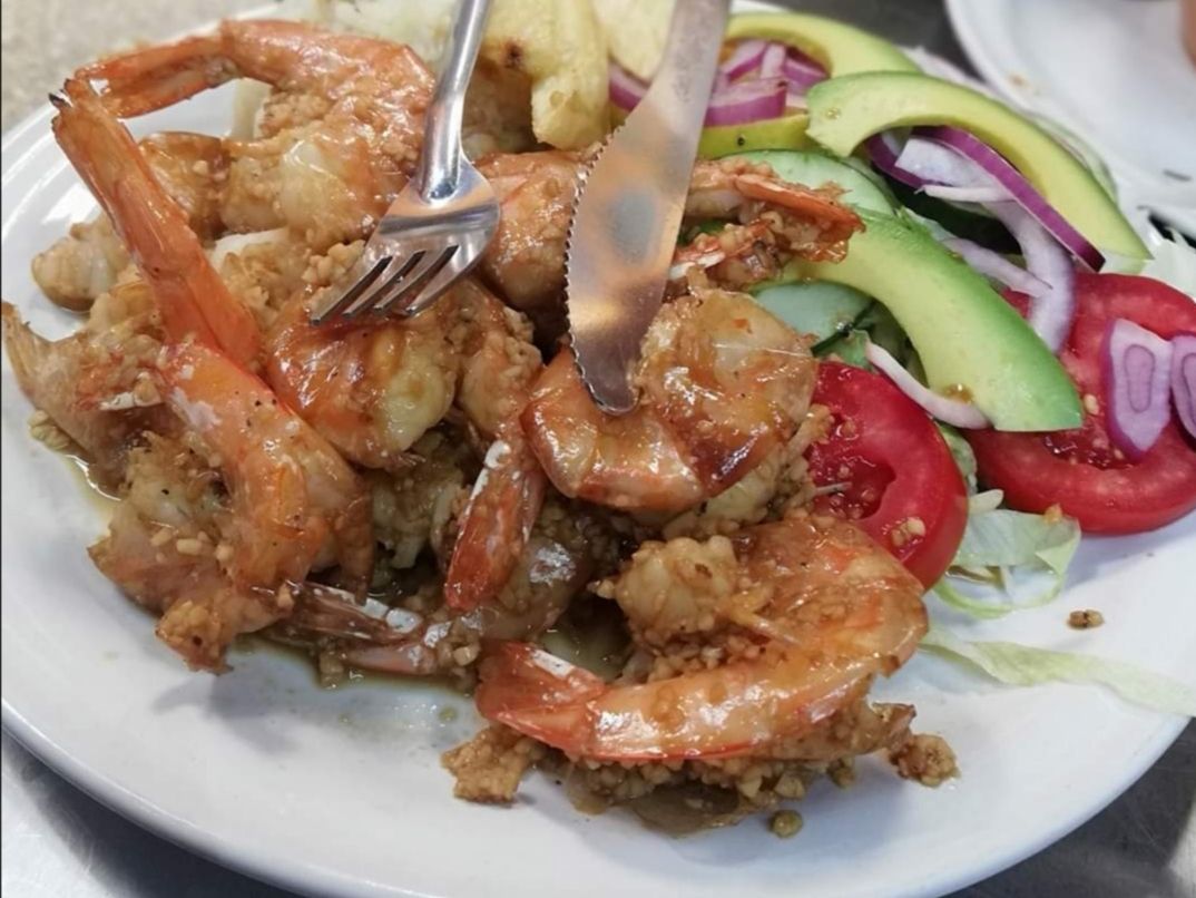 5 Camarones c/Cabeza talla 20/30 (180-190 g): Ajo picado, chile guajillo, mantequilla, pimienta, toque de salsas negras. Guarnición: Arroz, papa natural y ensalada.