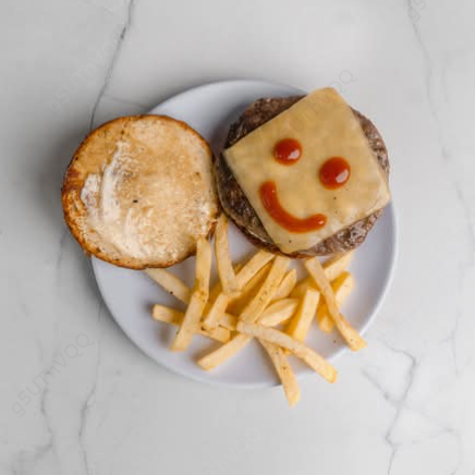Hamburguesa de res con queso manchego, salsa ketchup, mayonesa en pan artesanal de papa y acompañado de papas.