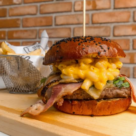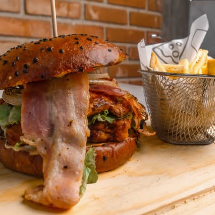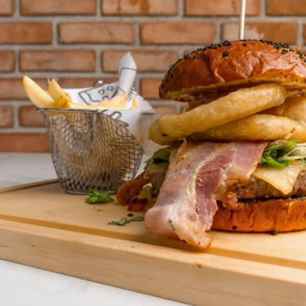 Pan artesanal de papa, carne de res, queso manchego, aros de cebolla, lechuga, cebolla caramelizada, jitomate, tocino, aguacate y papas.