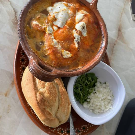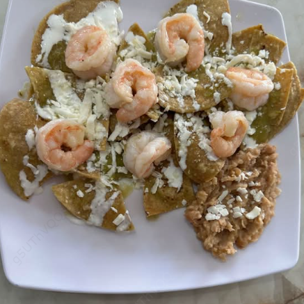 8 Camarones pelados corte mariposa sofritos en mantequilla premium, totopos bañados en salsas de elección, acompañados de frijoles, queso, crema y un bolillo aparte.