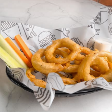 Deliciosos aros de cebolla preparados al momento acompañados con aderezo, 10 pzas.
