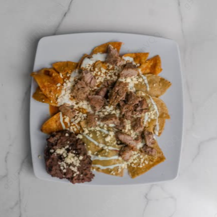 170 g Salsa verde acompañados con 1 bolillo, frijoles fritos, queso y crema.