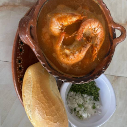 8 pzas De camarones pelados cocidos en mantequilla premium, salsa verde y acompañados con 1 bolillo, frijoles fritos, queso y crema.