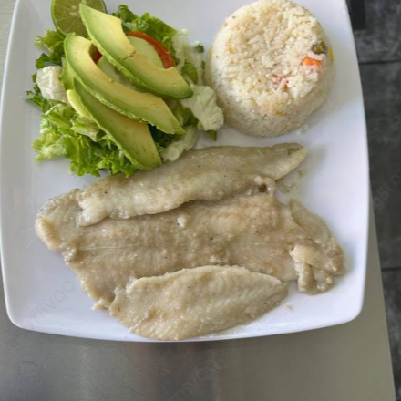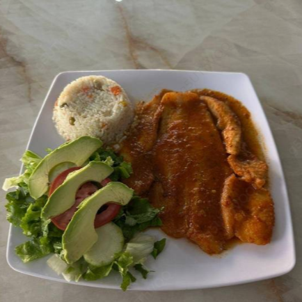 Filete cocido y bañado en su salsa, acompañados con arroz, ensalada y un bolillo.