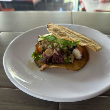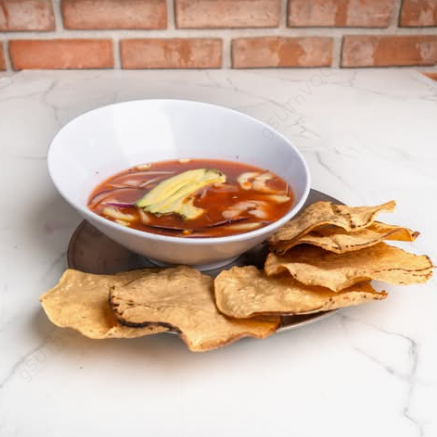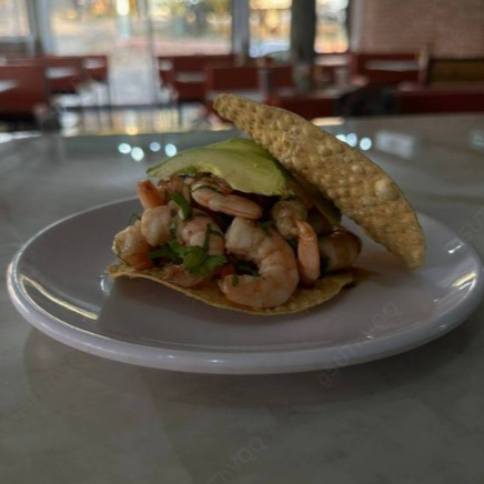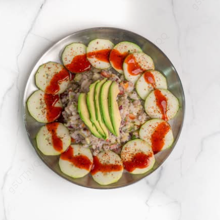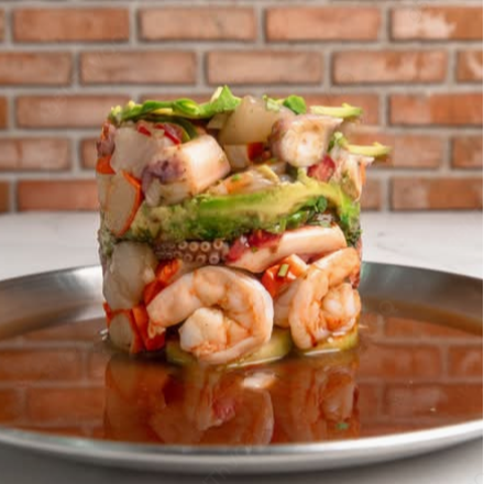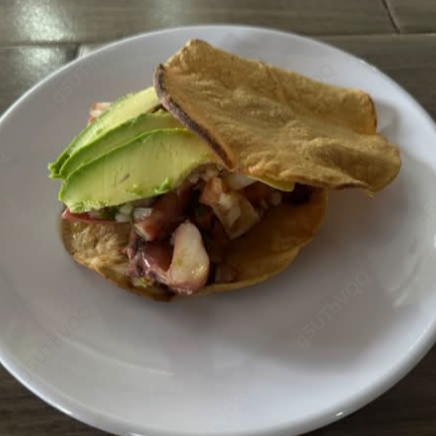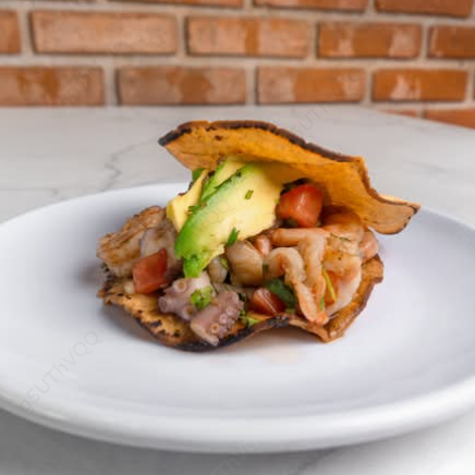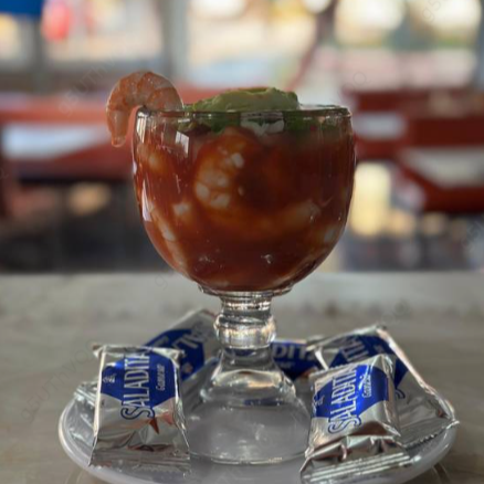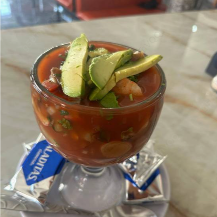 Camarones picados cocidos en limón, salsa habanera, clamato, medialunas de pepino, cebolla morada y aguacate, acompañado de tostadas.