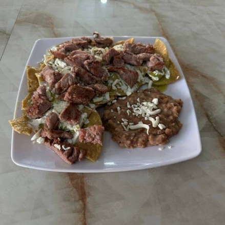 120 g De arrachera, totopos bañados en salsas de elección, acompañados de frijoles, queso, crema y un bolillo aparte.