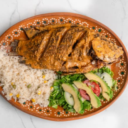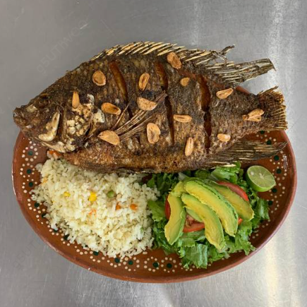 Frita y bañada en salsa al mojo de ajo acompañada de chips de ajo, arroz, ensalada y bolillo.