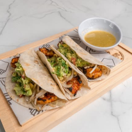Orden de 3 tacos de camarón zarandeado, con cebolla caramelizada, guacamole y salsa verde.