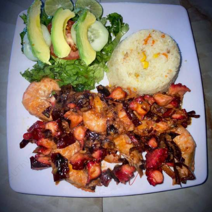 Frita y bañada en salsa a la diabla, acompañados con arroz, ensalada y bolillo.