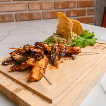Brochetas de camarón zarandeado acompañados de una cama de lechuga y guacamole.