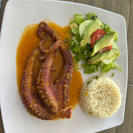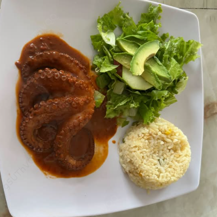 Cocido bañado en su salsa, acompañados de arroz, ensalada de lechuga, jitomate, pepino y aguacate e incluye bolillo.