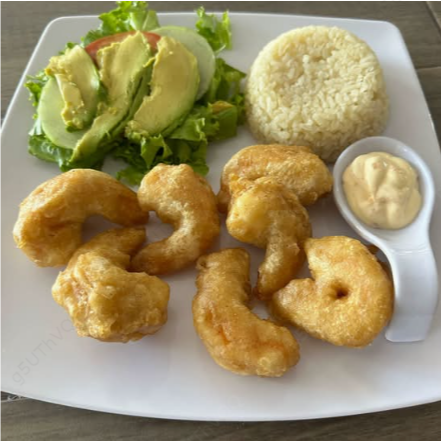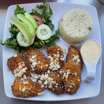 Empanizados en pan molido y coco con hojuelas de coco tostado, acompañados de arroz, ensalada y bolillo, 7 Pzas.