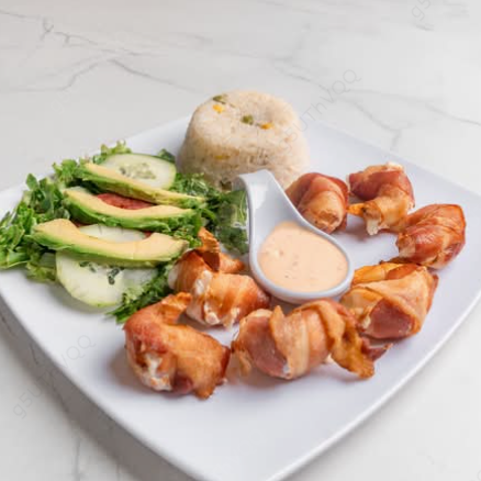 Rellenos de queso Philadelphia y Oaxaca envueltos en tocino con aderezo de la casa, arroz, ensalada y bolillo, 7 Pzas.