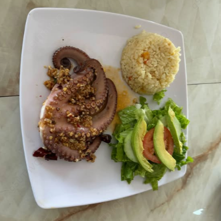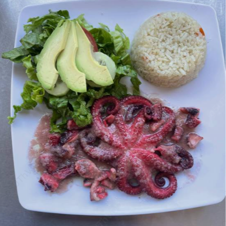 Cocidos con ajo picado y chile guajillo en mantequilla premium, acompañados de arroz, ensalada y bolillo, 5 pzas De camarón y pulpo picado.