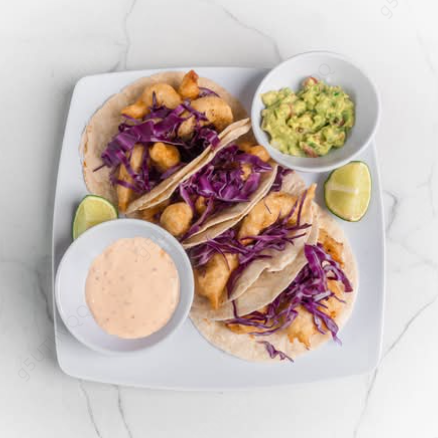 Orden de 2 tacos de camarón con pulpo, tocino en salsa chipotle y costra de queso, con tortilla de harina, acompañados de crema, pico de gallo, guacamole y col.
