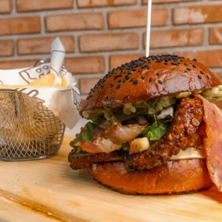 Pan artesanal de papa, tentáculos de pulpo zarandeados, queso manchego, lechuga, cebolla, tocino, guacamole, aderezo y papas.