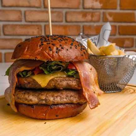 Pan artesanal de papa, doble carne de res, doble queso manchego, lechuga, cebolla caramelizada, jitomate, tocino, aguacate y papas.