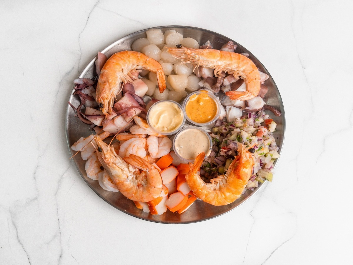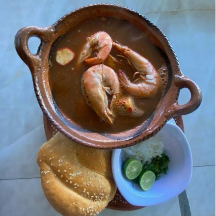 3 pzas De camarón, zanahoria y papas cocidas, queso Oaxaca, surimi, pulpo, calamar, callo de almeja, chirlas, camarón pelado, calamar blanco y filete, 1 L acompañados de bolillo, cebolla, cilantro y limones.