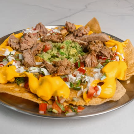 Totopos, queso amarillo, jalapeño, pico de gallo, arrachera picada, lechuga y guacamole.