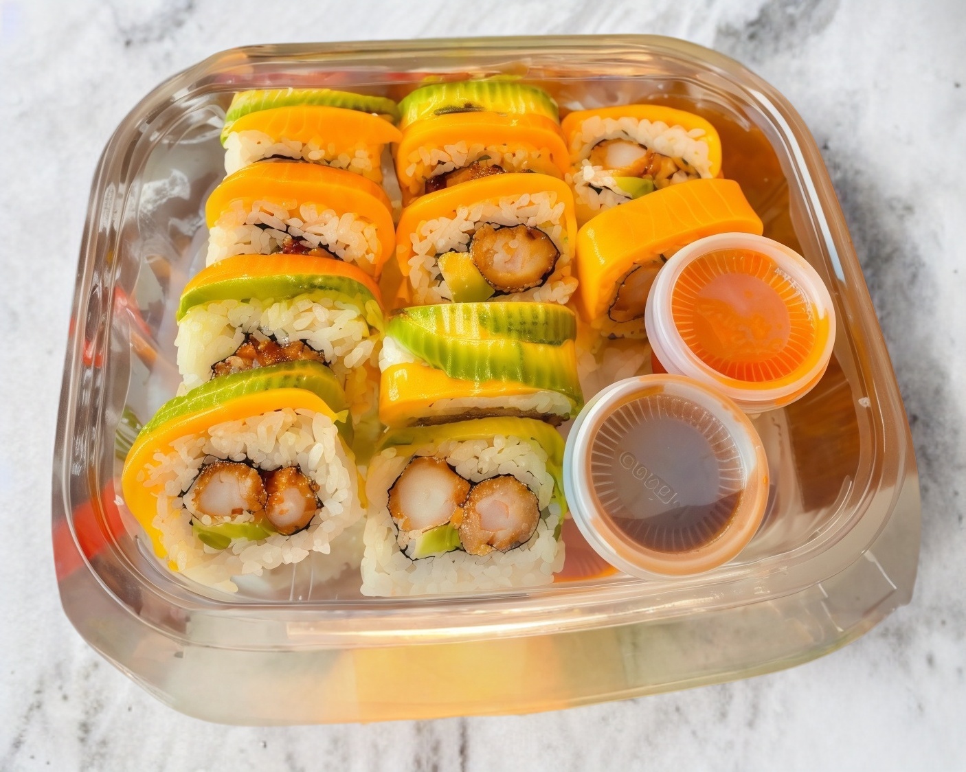 Por dentro: Camarón empanizado, queso crema y aguacate. Por fuera:: mango y aguacate.