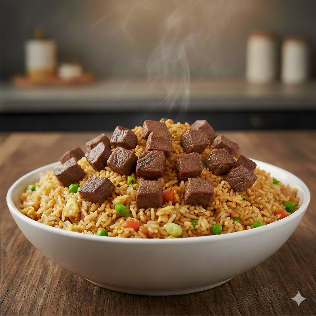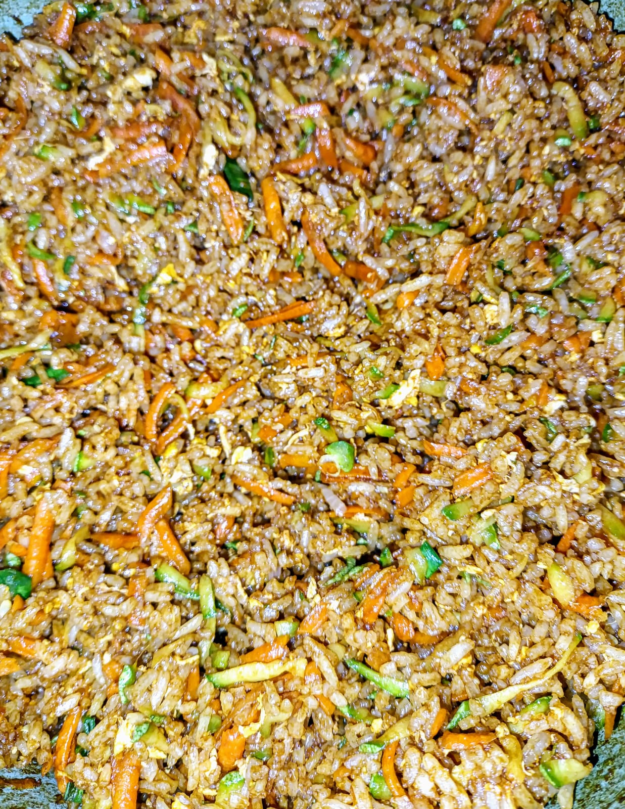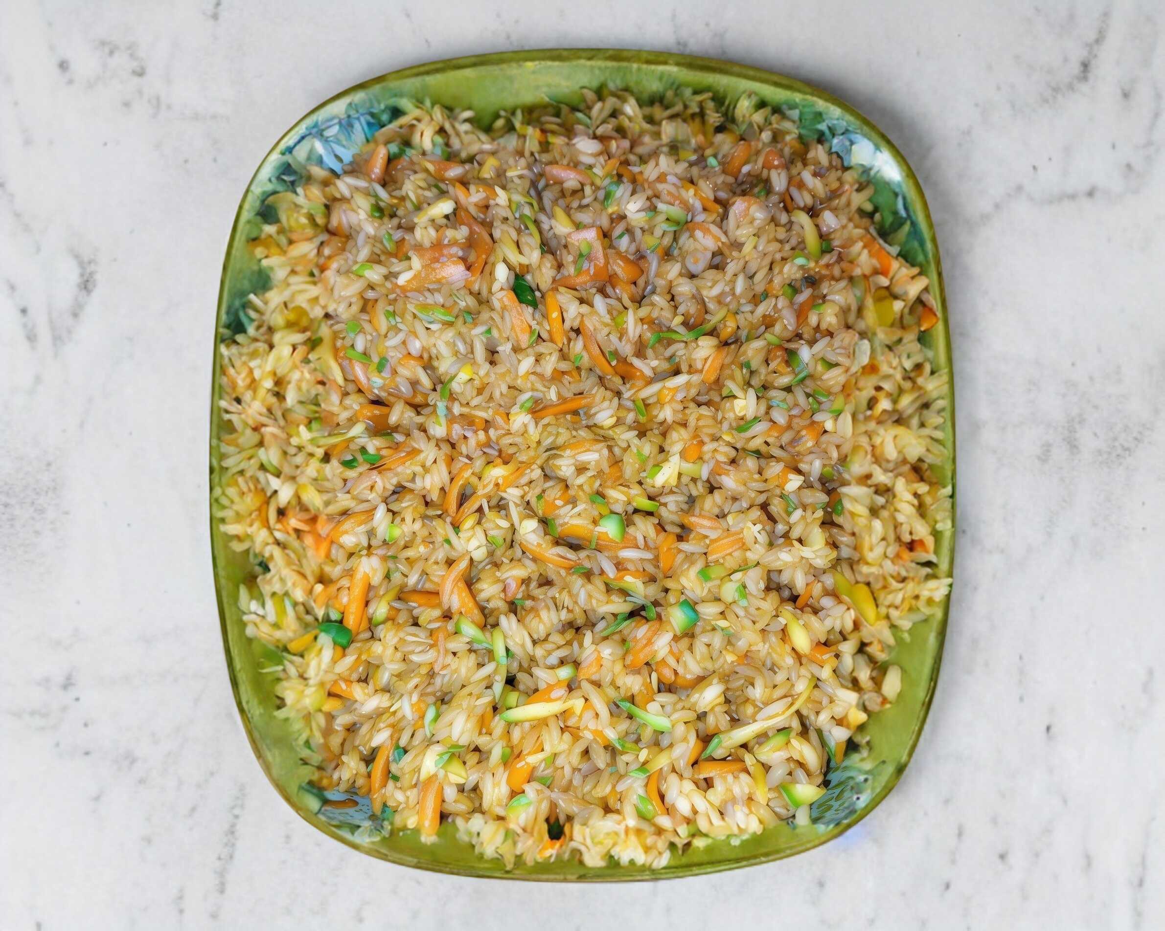 Arroz frito con calabaza, zanahoria, pimientos, y huevo.