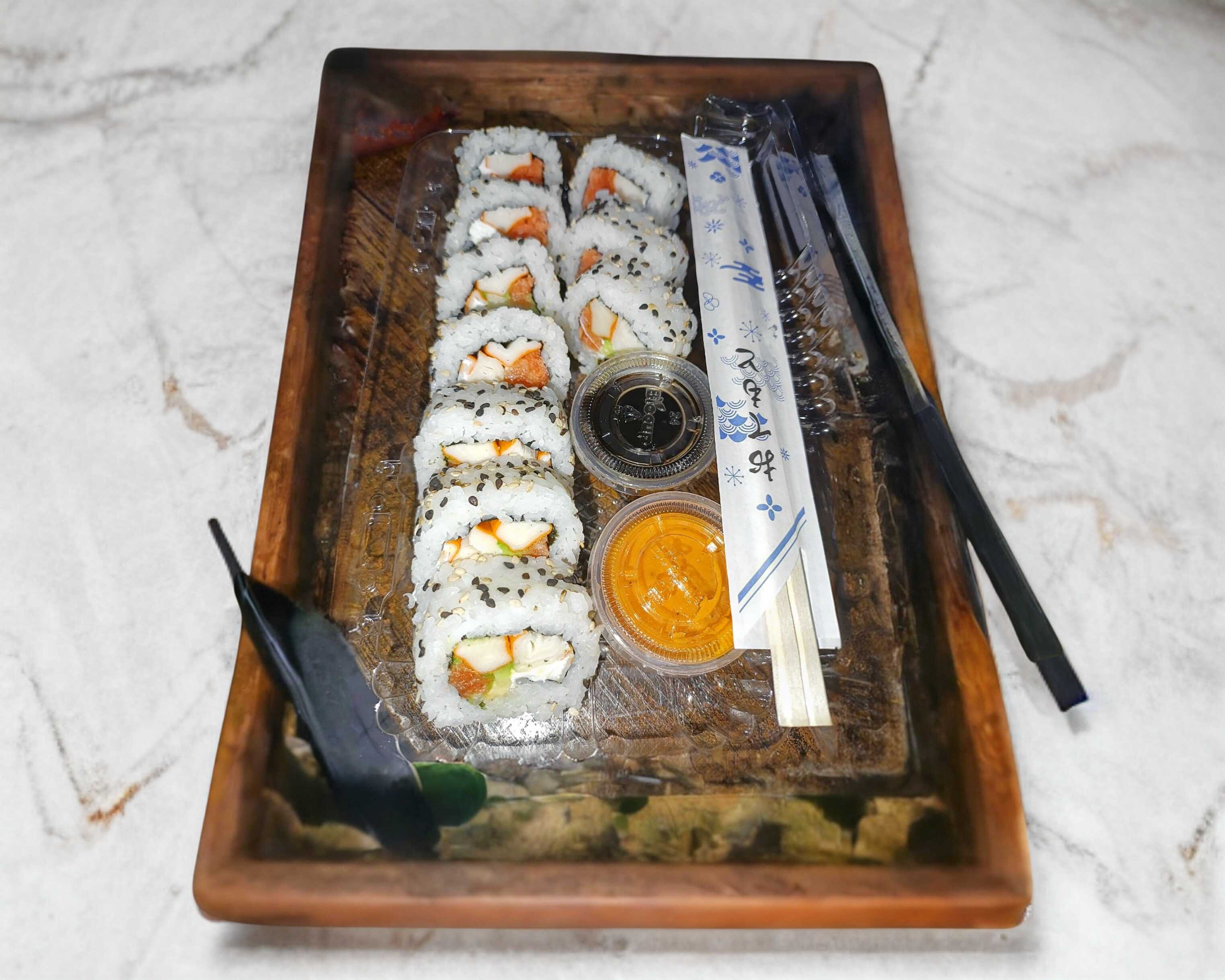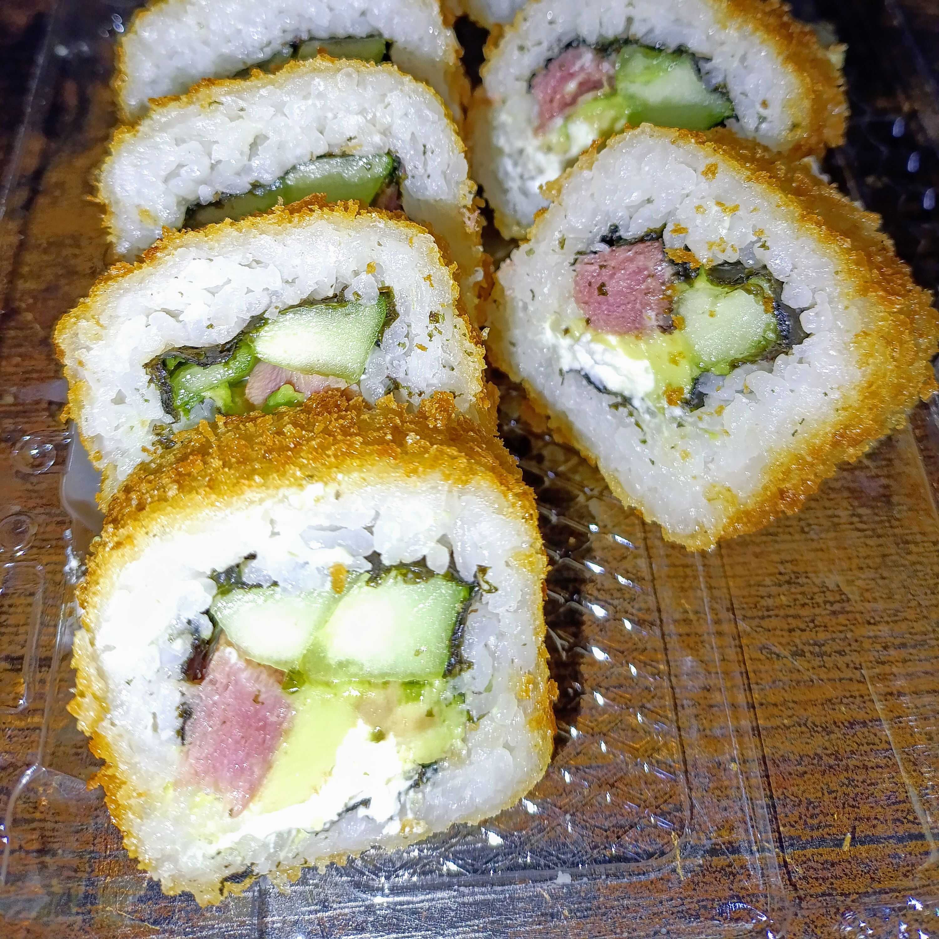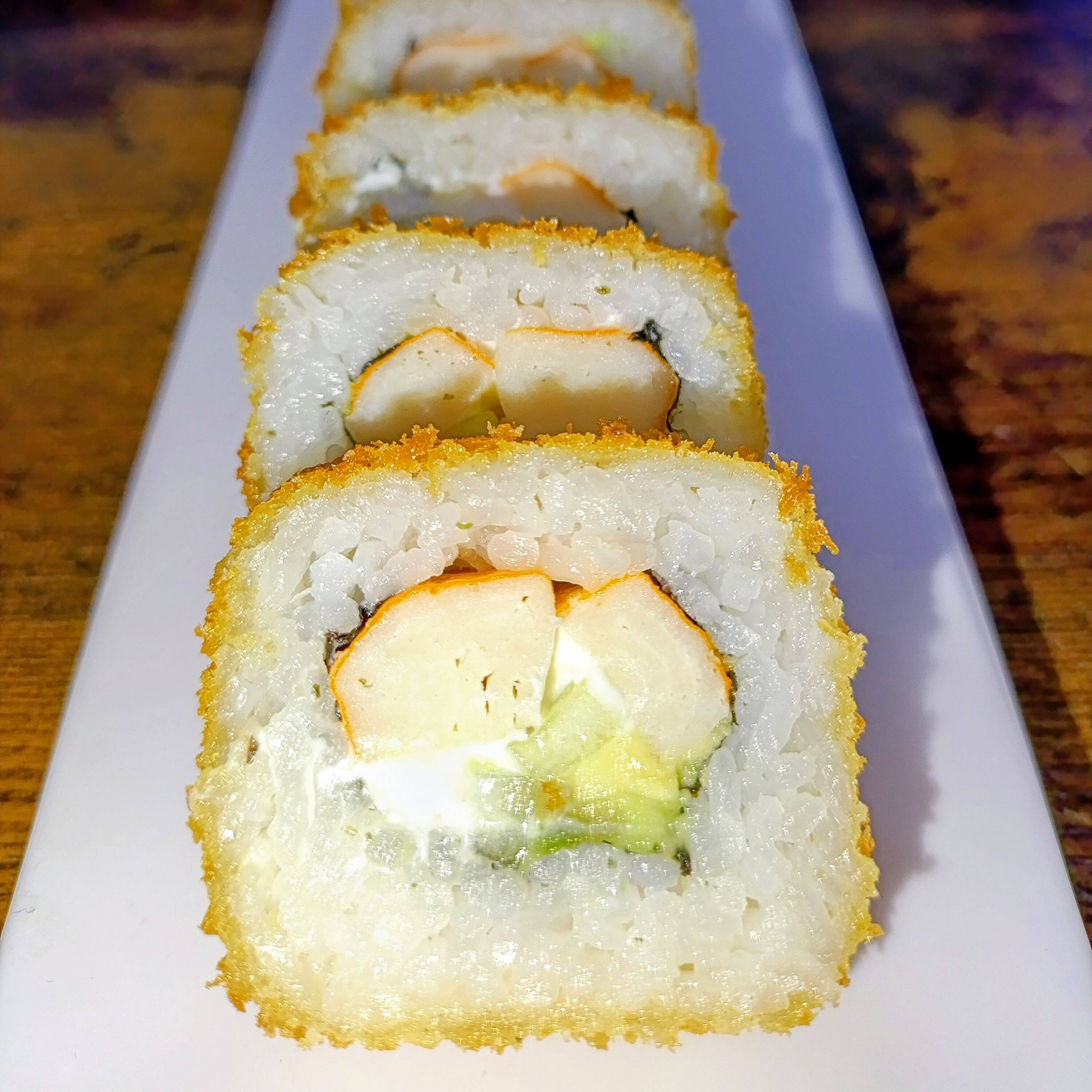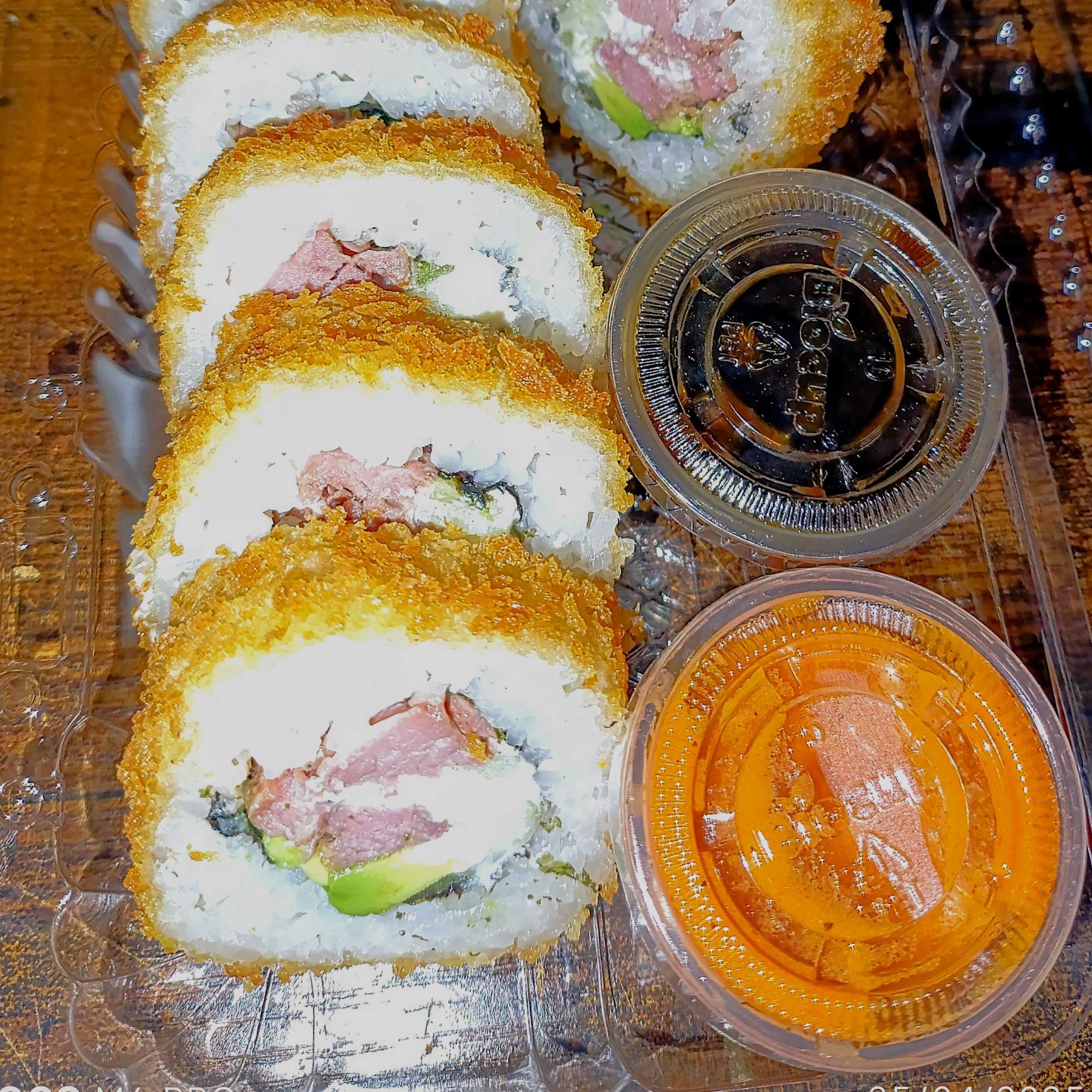 Por dentro: Surimi, queso crema y aguacate. Por fuera: empanizado, tampico y camarones empanizados