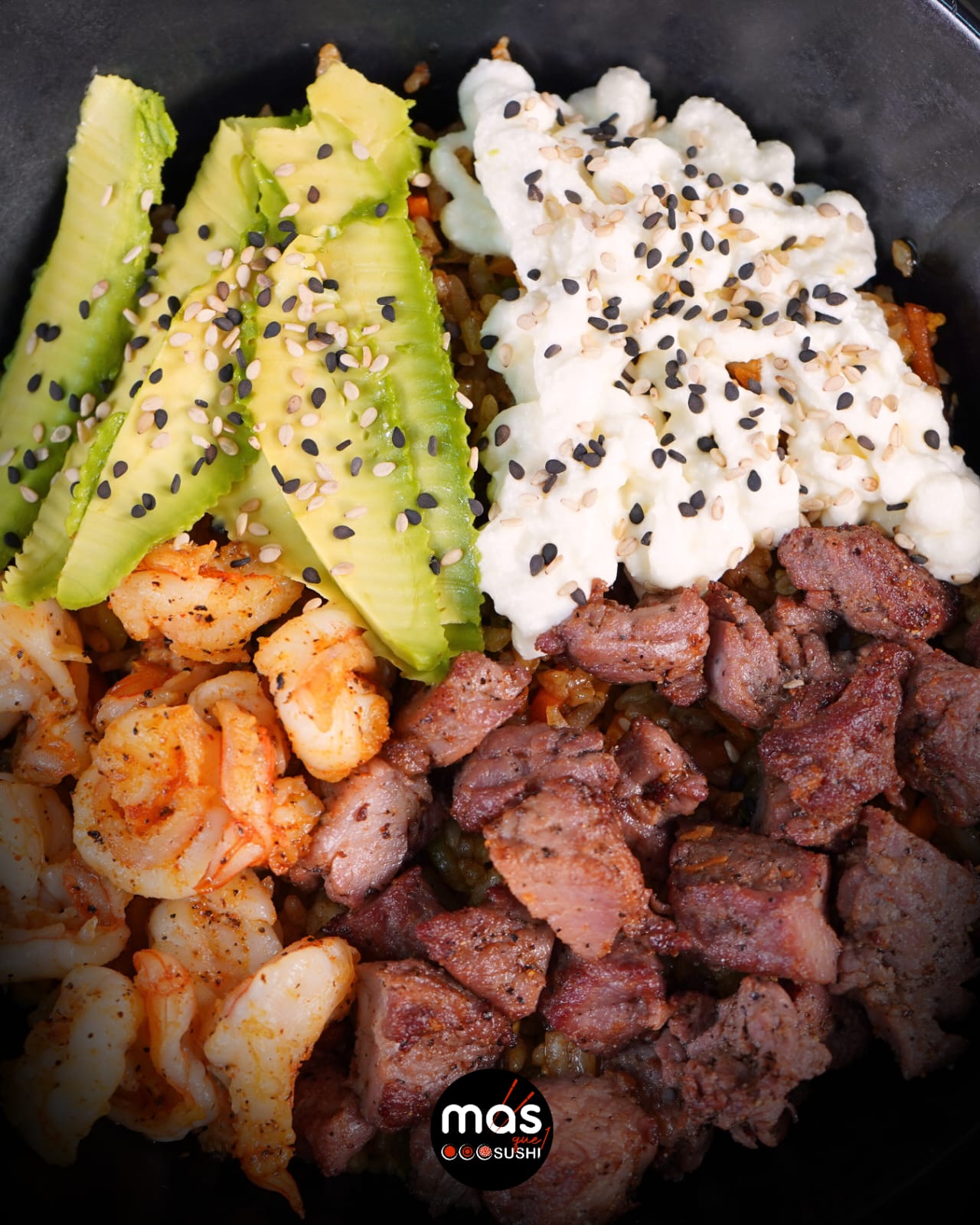 Dos proteínas a elegir (pollo, res, camarón o arrachera) con queso crema y aguacate.