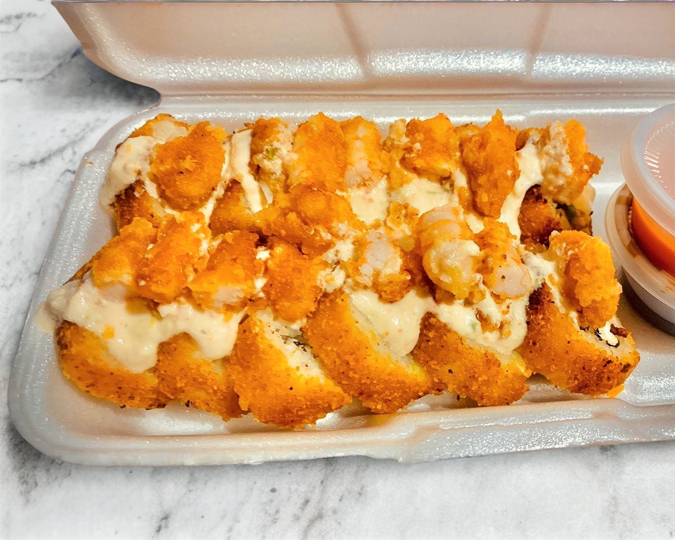 Por dentro: Camarones picantes, queso crema y aguacate. Por fuera: empanizado, gratinado con queso y un toque de chile seco.