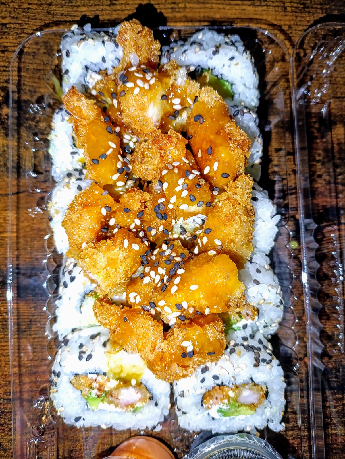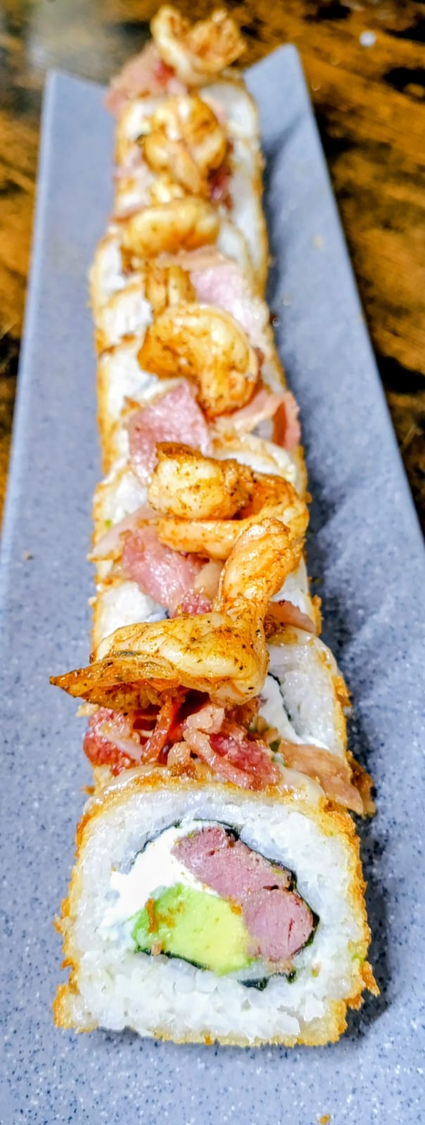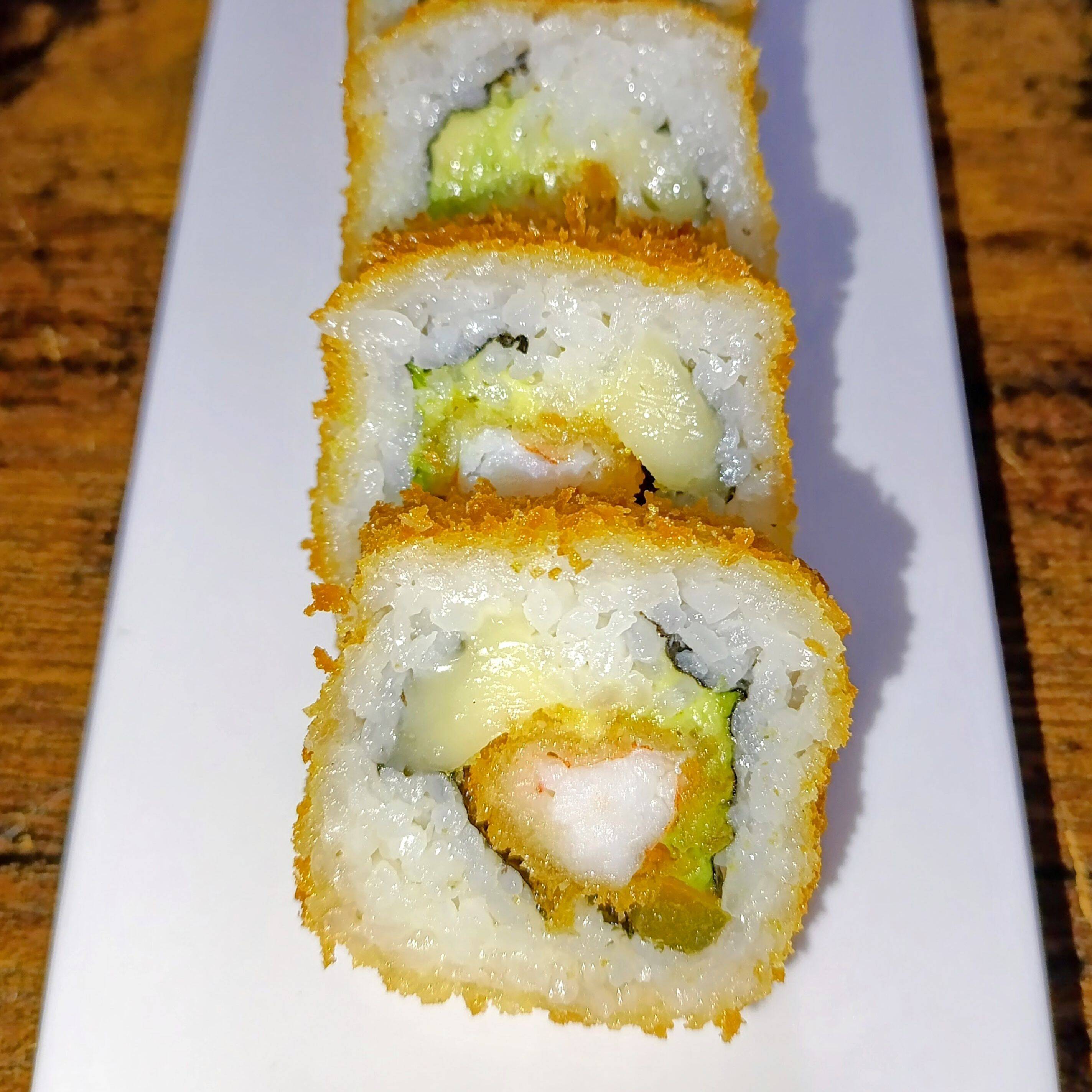 Por dentro:Camarones, queso crema y aguacate. Por fuera: camarones empanizados, salsa fuji y ajonjolí.