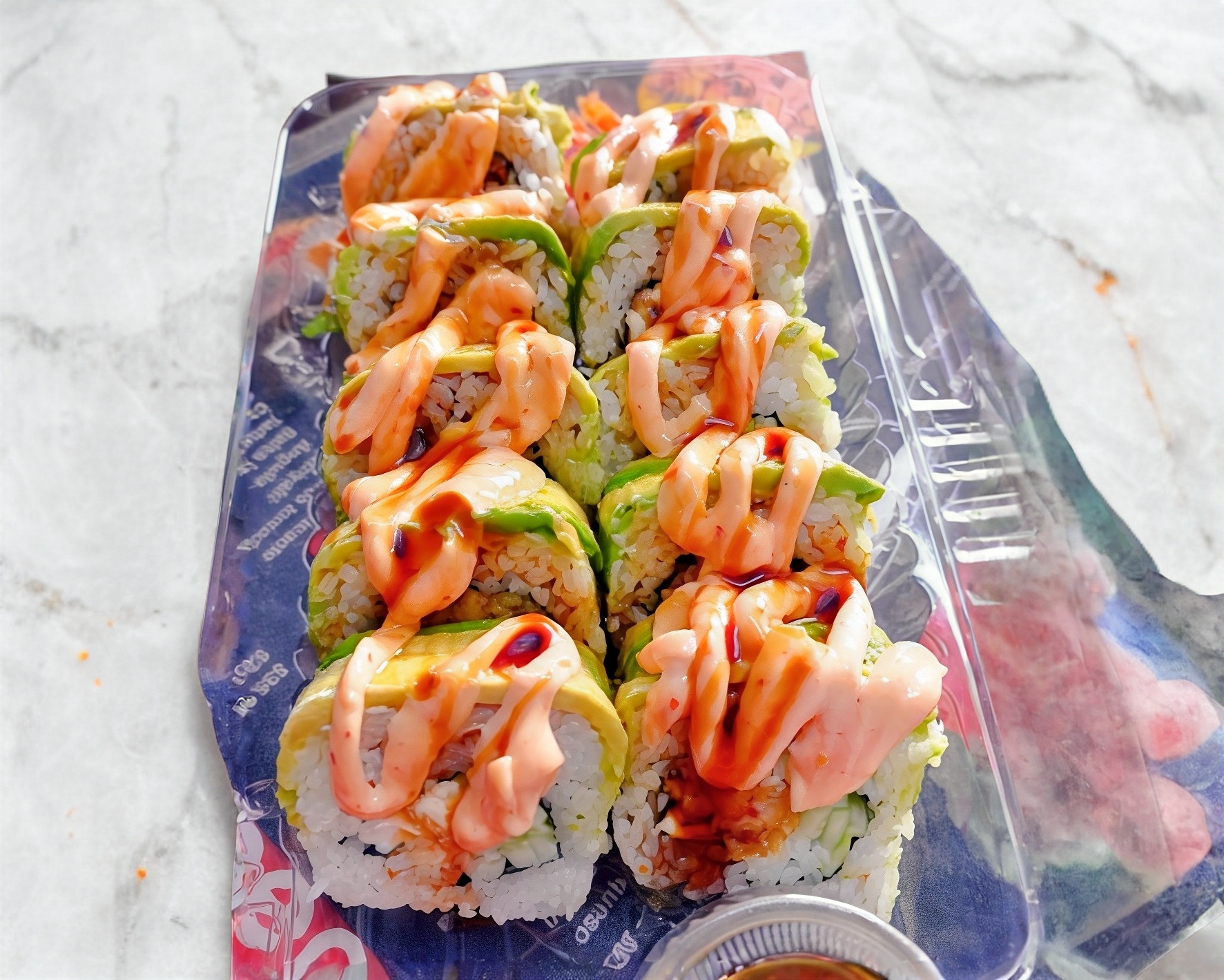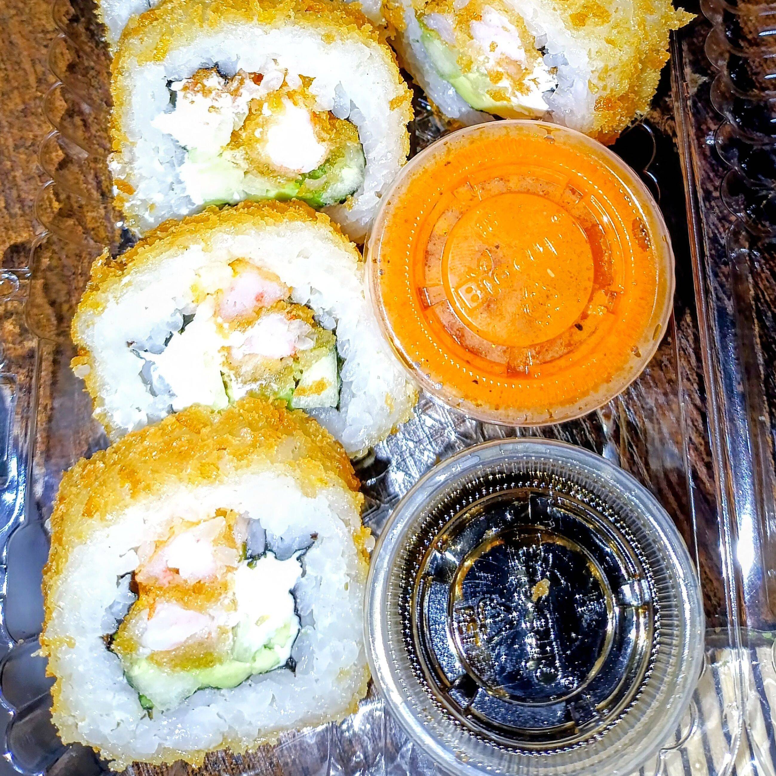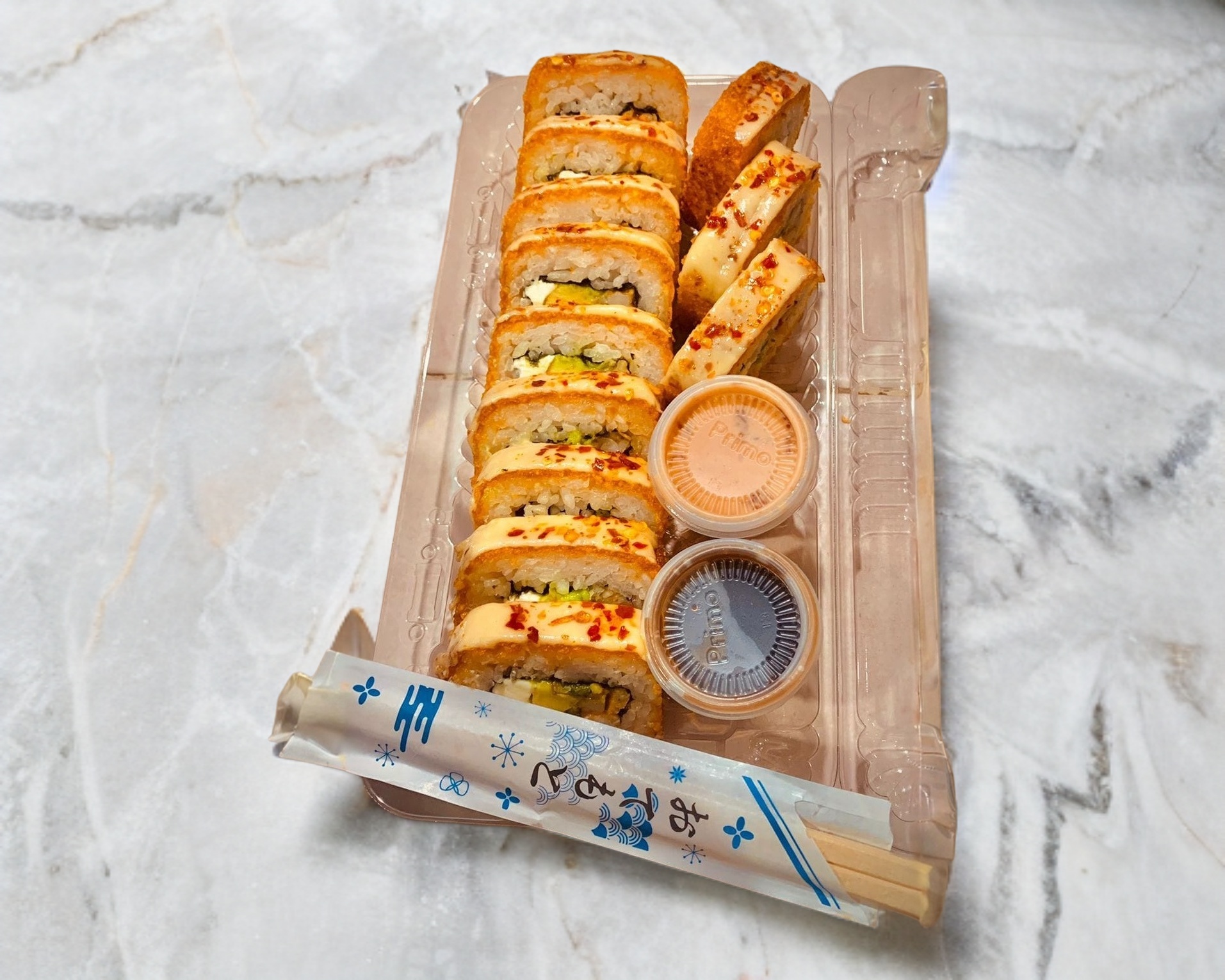 Por dentro: Camarones empanizados, surimi, queso crema, y aguacate. Por fuera: alga empanizada, spacy mayo y salsa anguila.