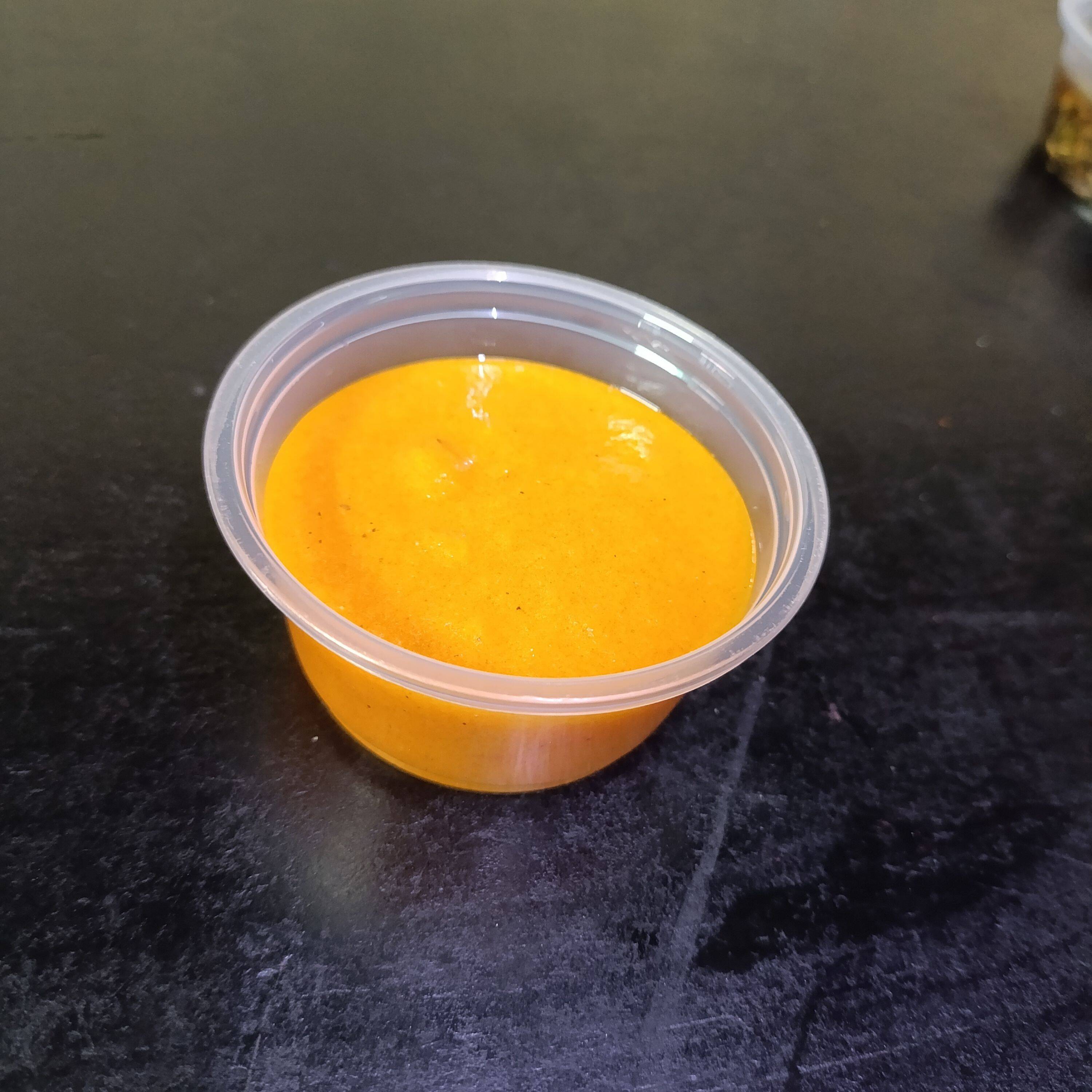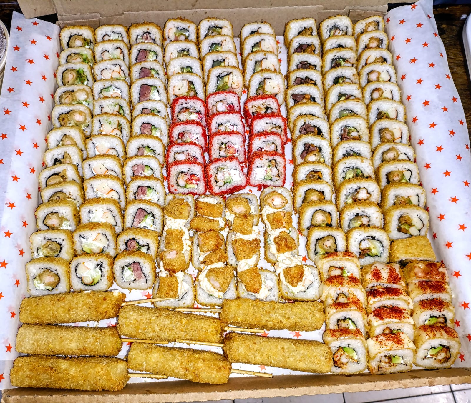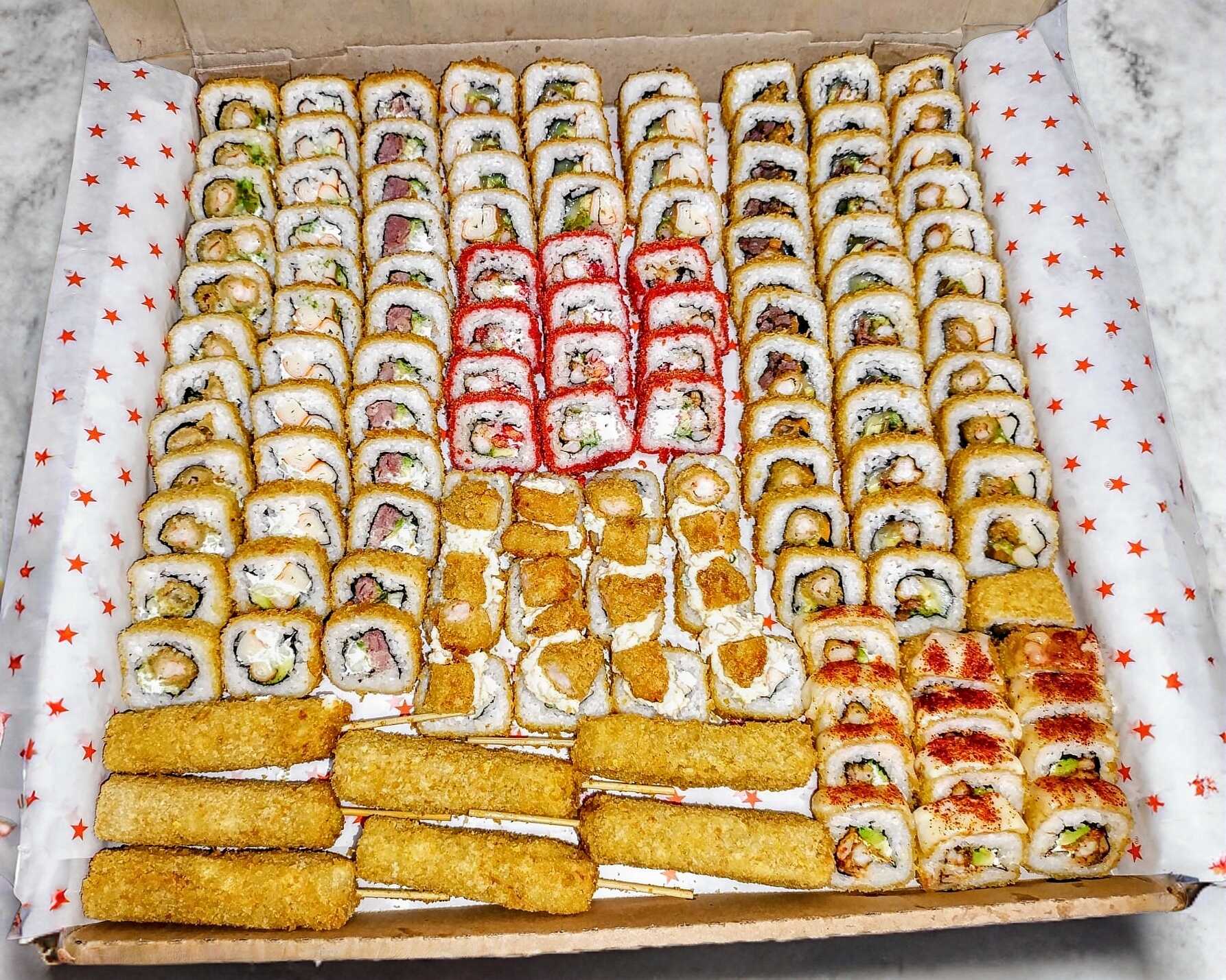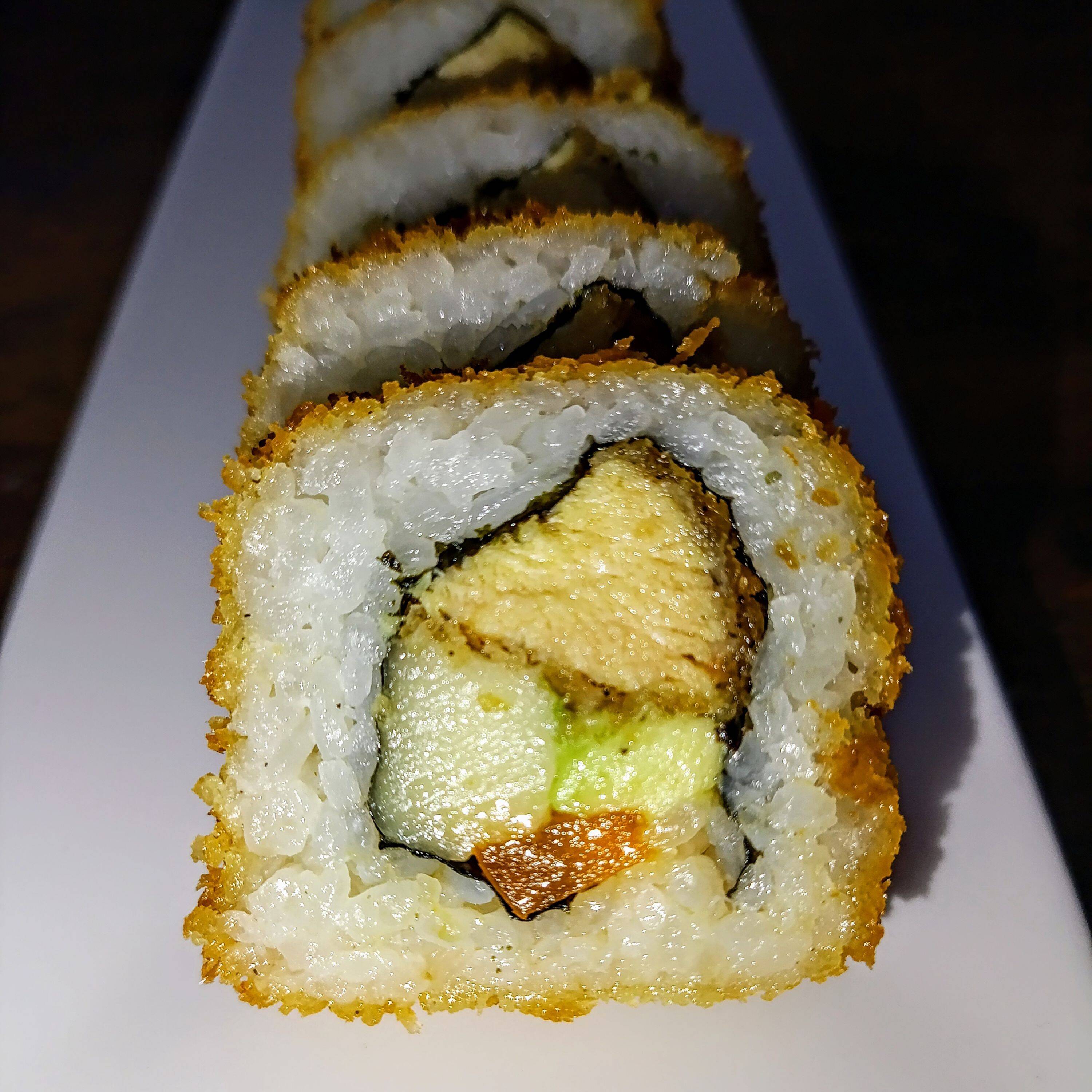 Por dentro: Camarones empanizados, surimi, queso crema, y aguacate. Por fuera: alga empanizada, spacy mayo y salsa anguila.