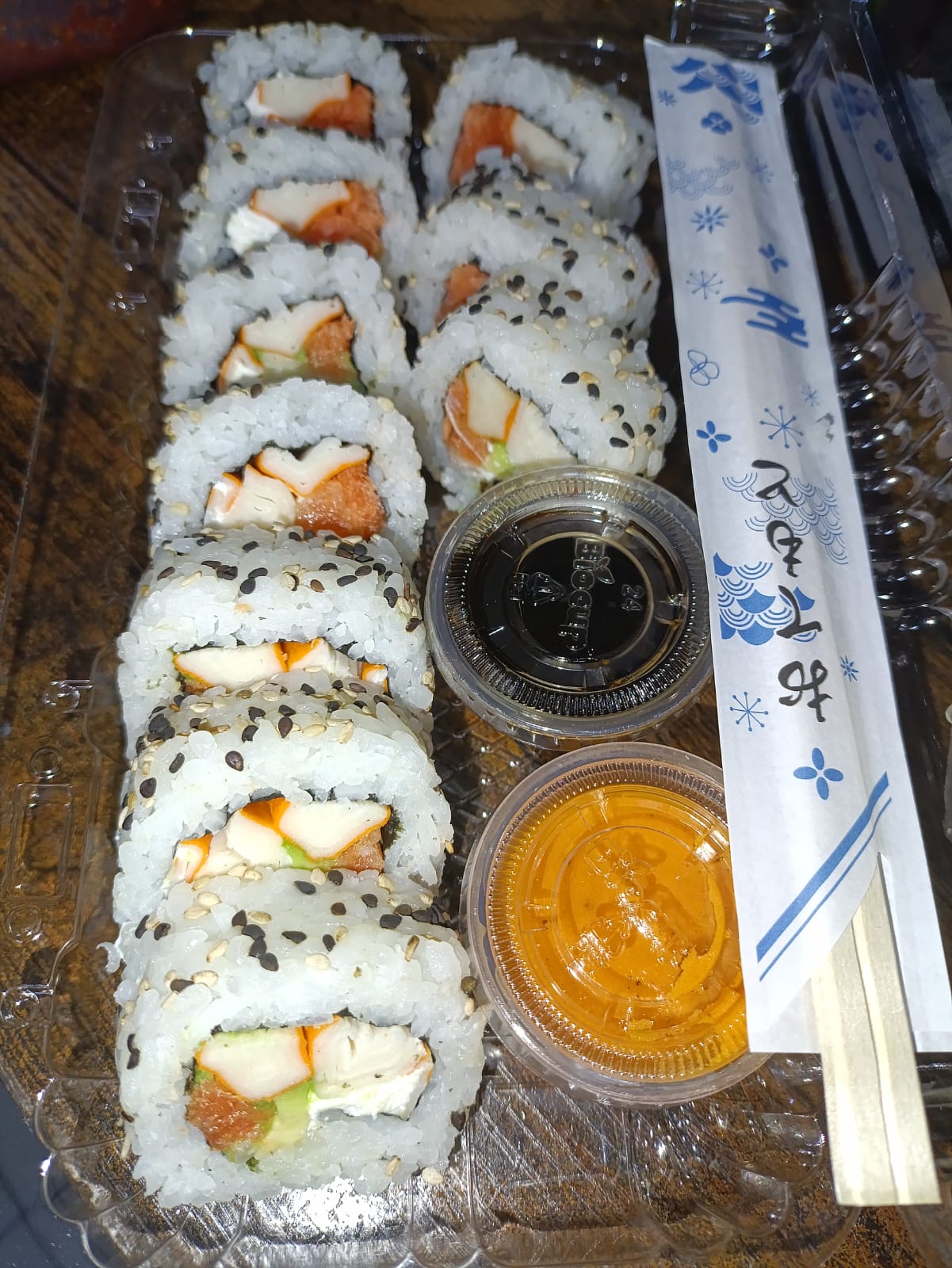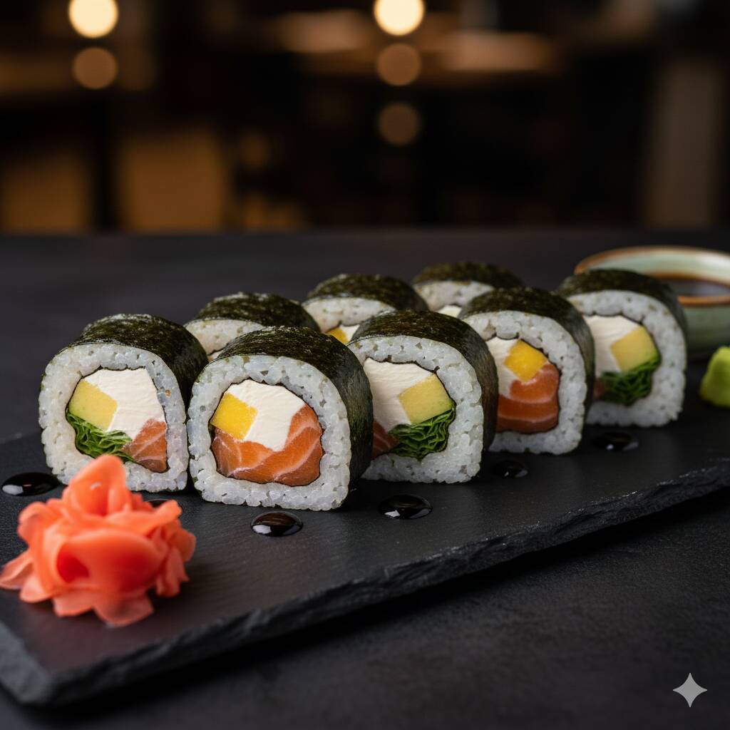 Por dentro: Salmón, mango, queso crema y aguacate. Por fuera: alga.