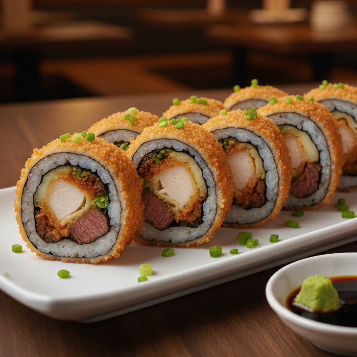 Por dentro: Arrachera, aguacate y queso crema. Por fuera: Alga empanizada, spacy mayo y salsa anguila.