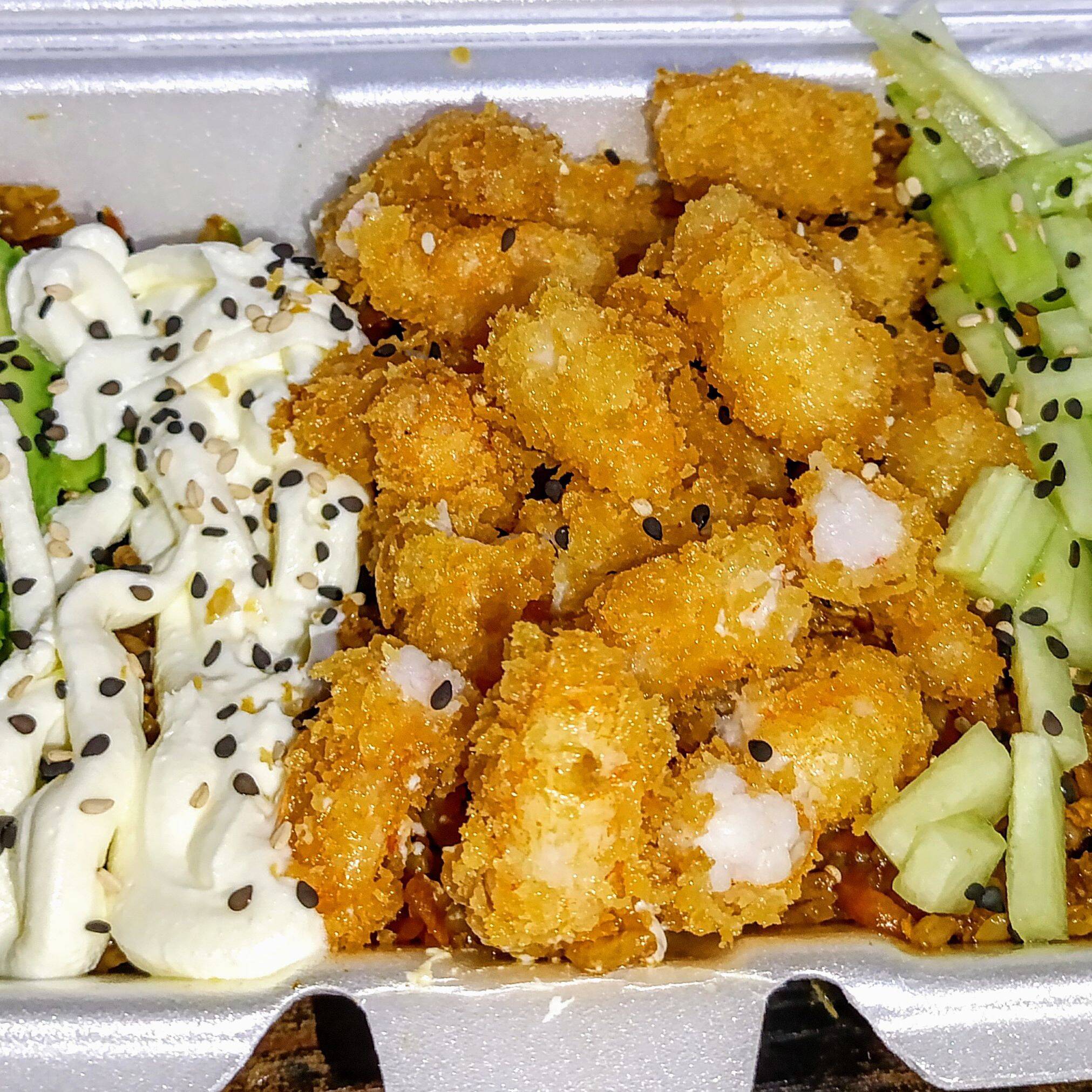 Camarones empanizados, salsa tampico, queso crema, aguacate y pepino.