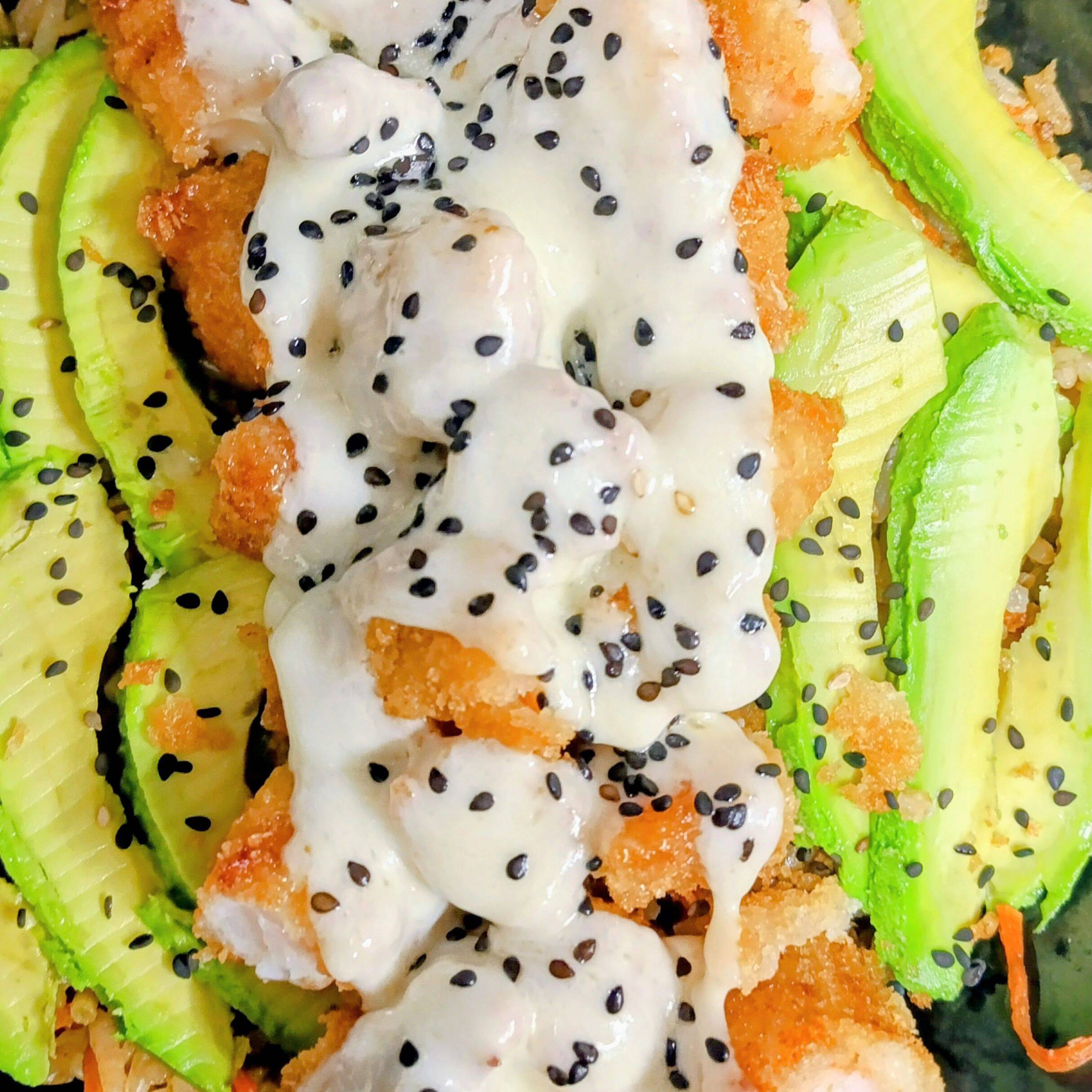 Camarones empanizados, queso derretido, aguacate y ajonjolí.