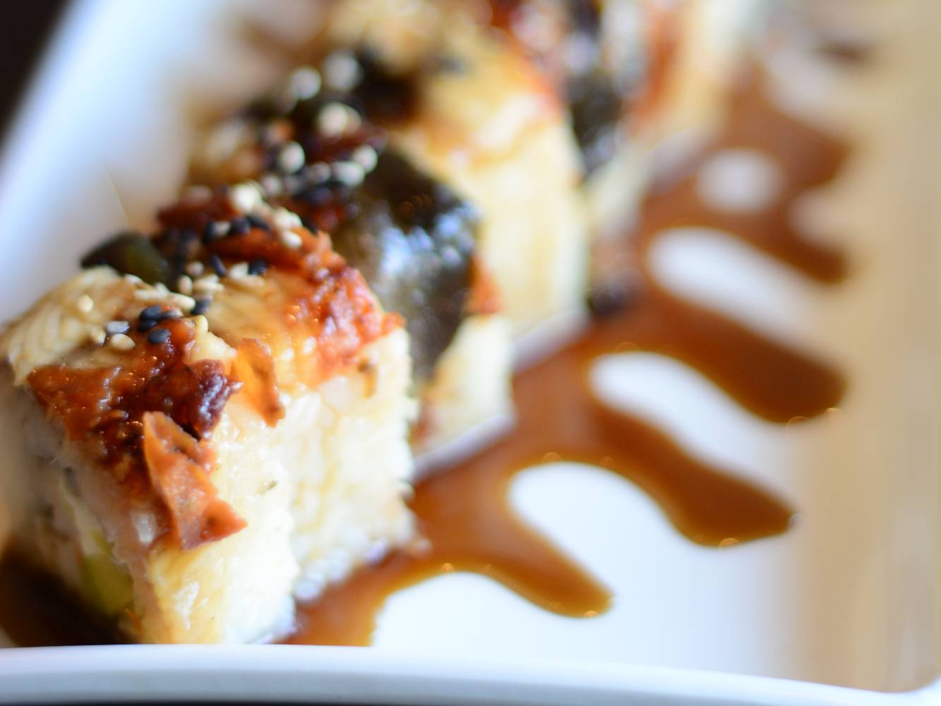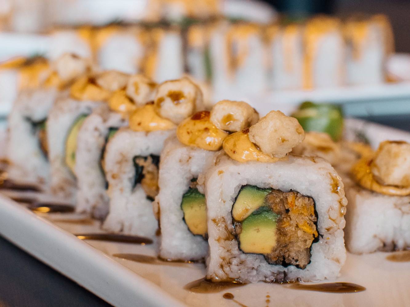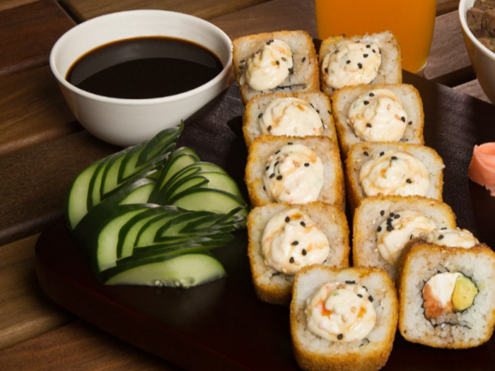 Aguacate, Salmon y Cangrejo por fuera. Queso Crema, Pepino y Camaron Empanizado Salsa Tampico, Salsa Chipotle y kushiage