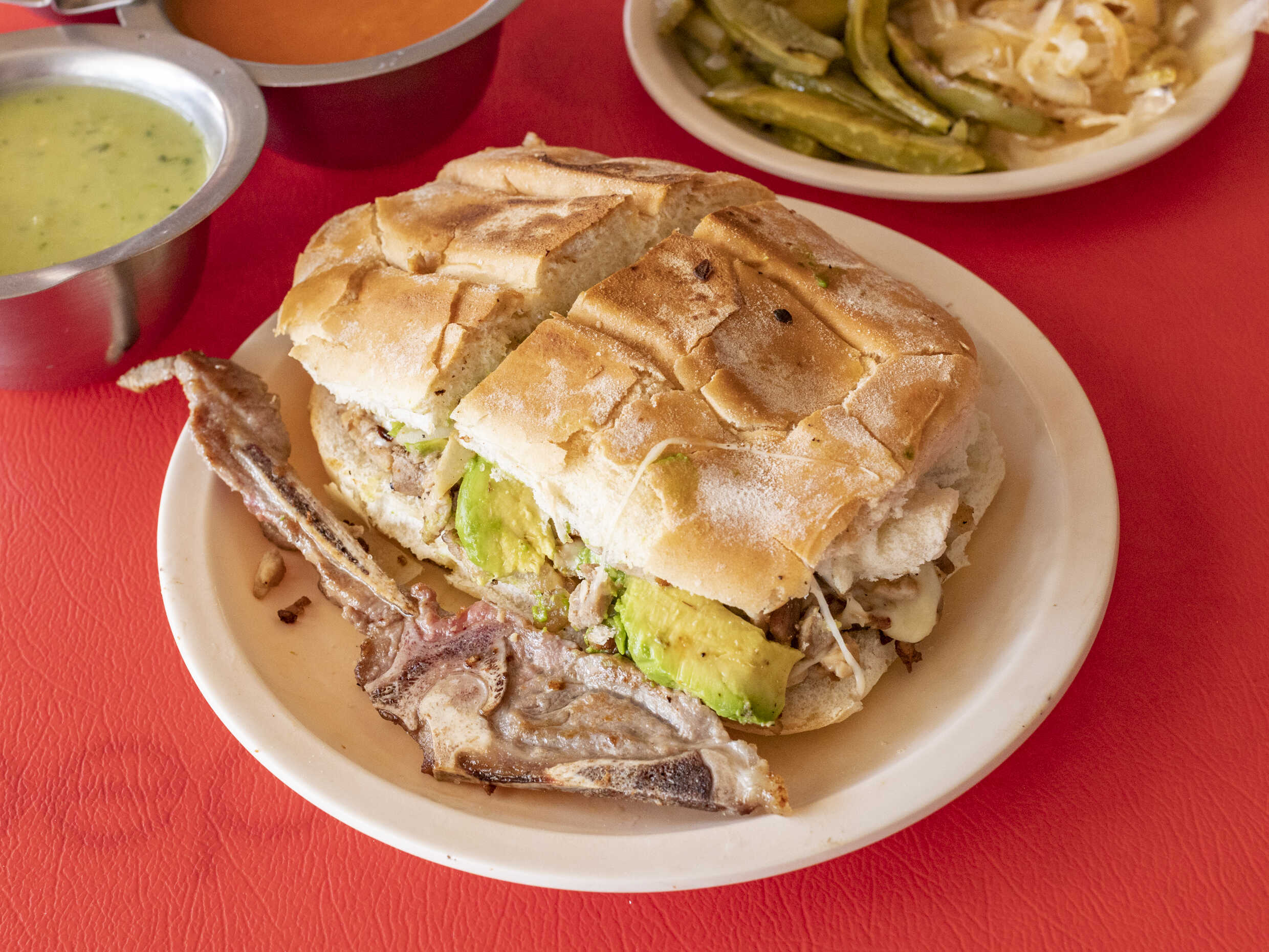 Costilla, tocino, morrón.
