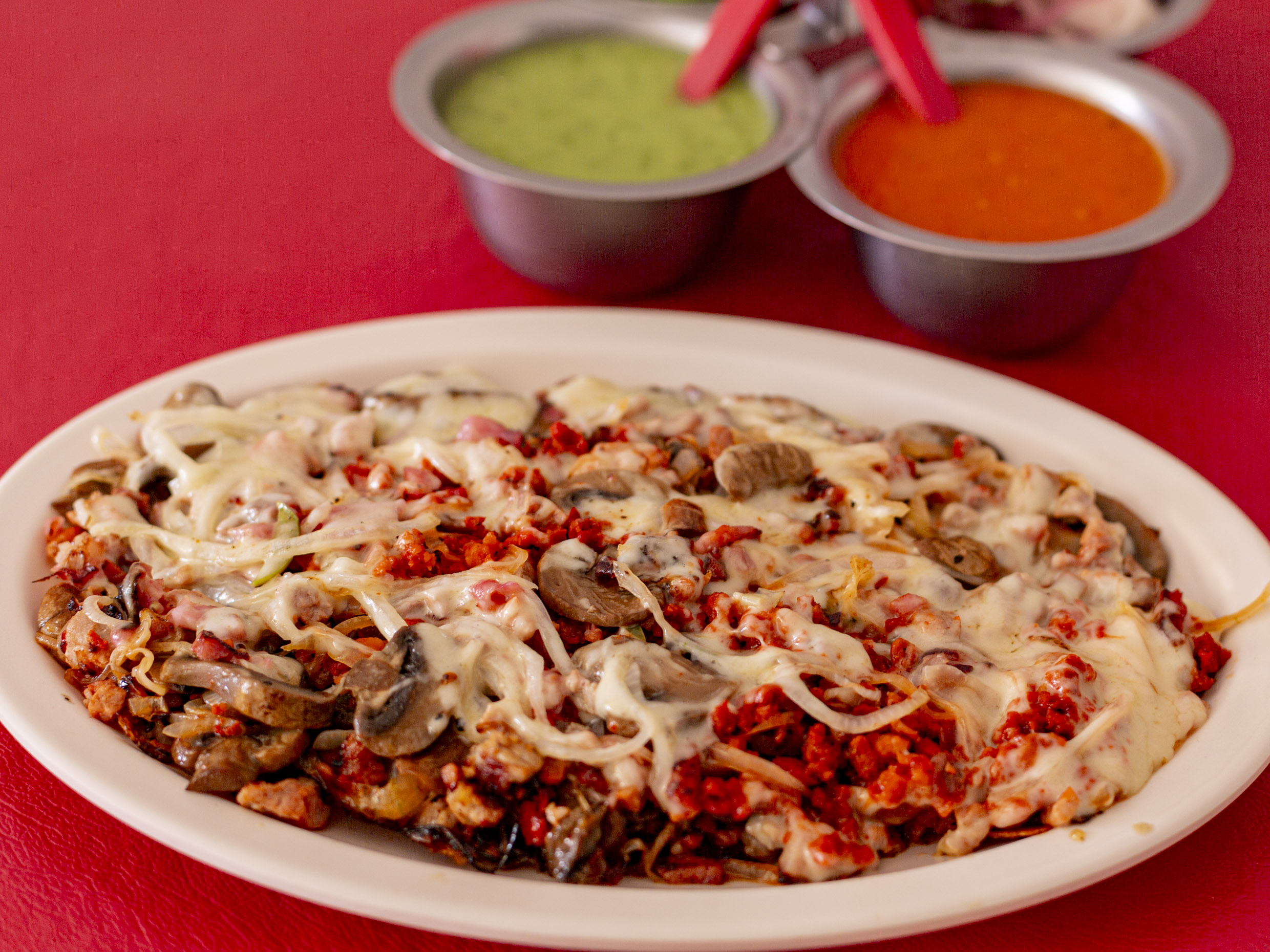 Bistec, cebolla, chorizo, champiñón, tocino, queso.