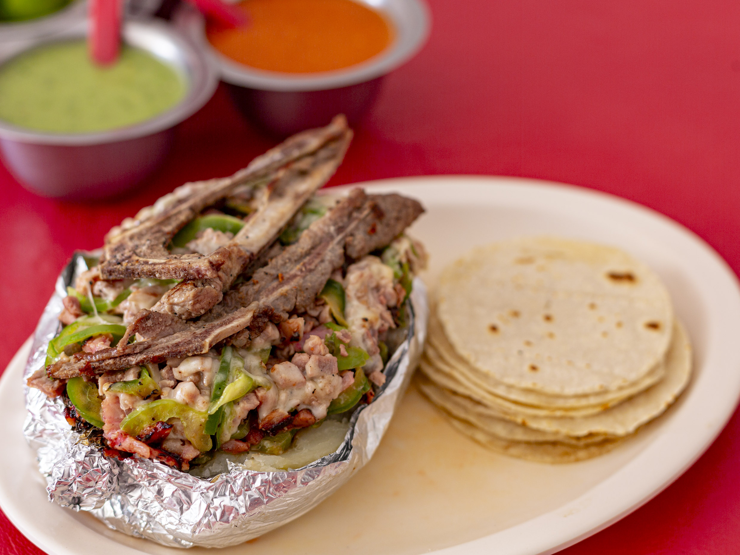 Elige tu carne pastor, bistec, costilla o chuleta.