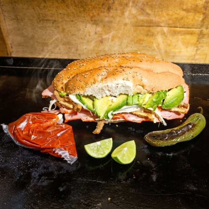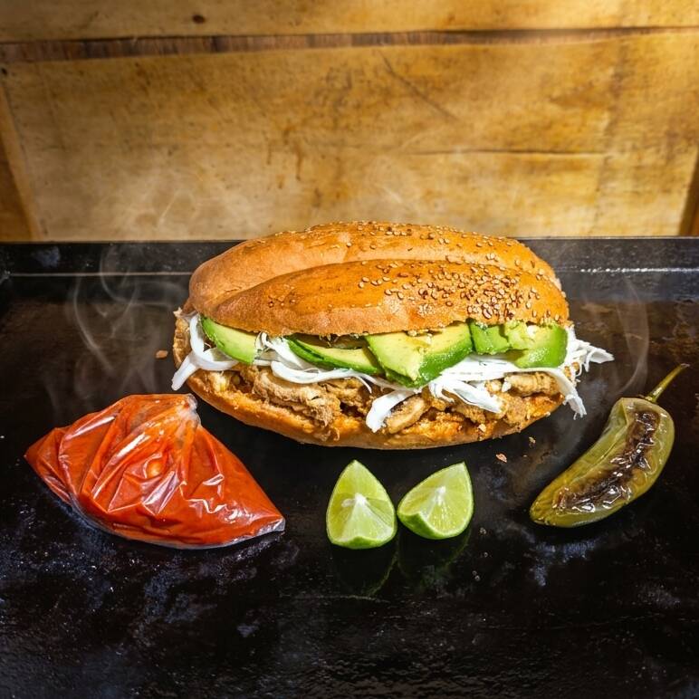 Milanesa de res,queso Oaxaca, aguacate, mantequilla, mayonesa, salsa de chipotle, limón y chile toreado