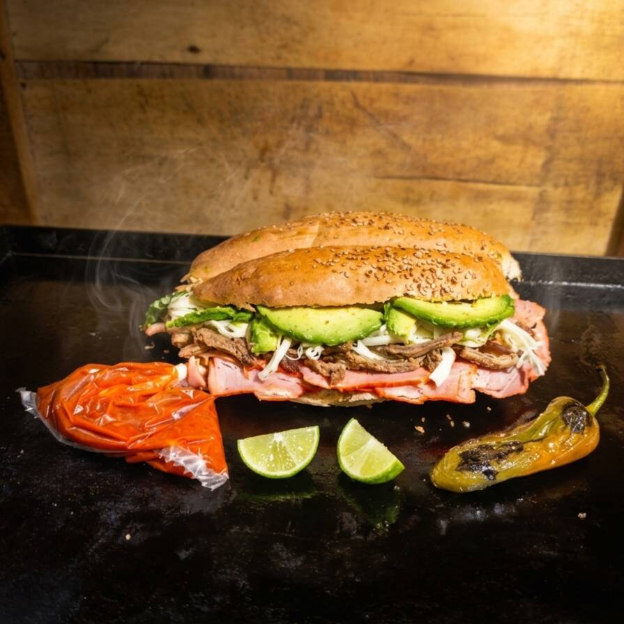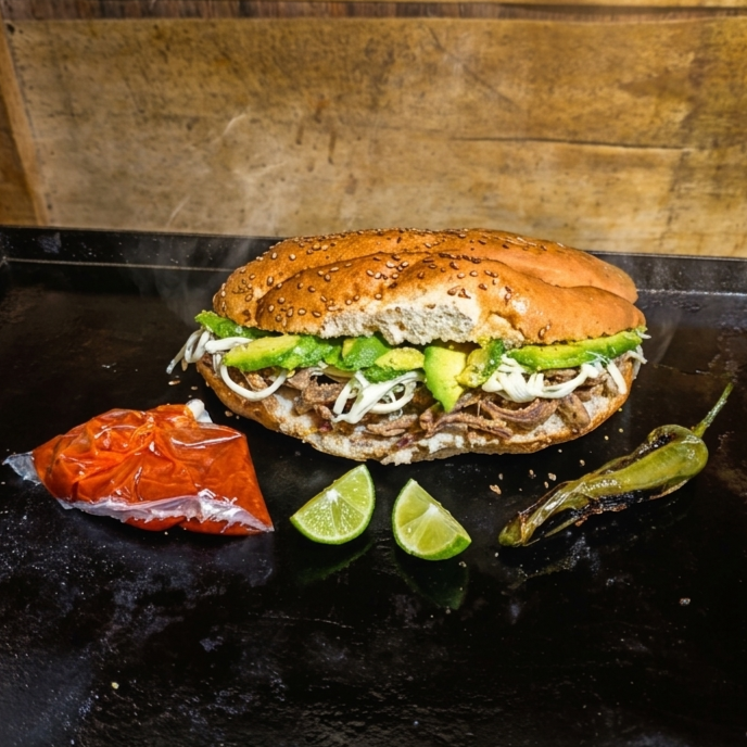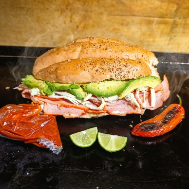Pierna,queso Oaxaca, aguacate, mantequilla, mayonesa, salsa de chipotle, limón y chile toreado