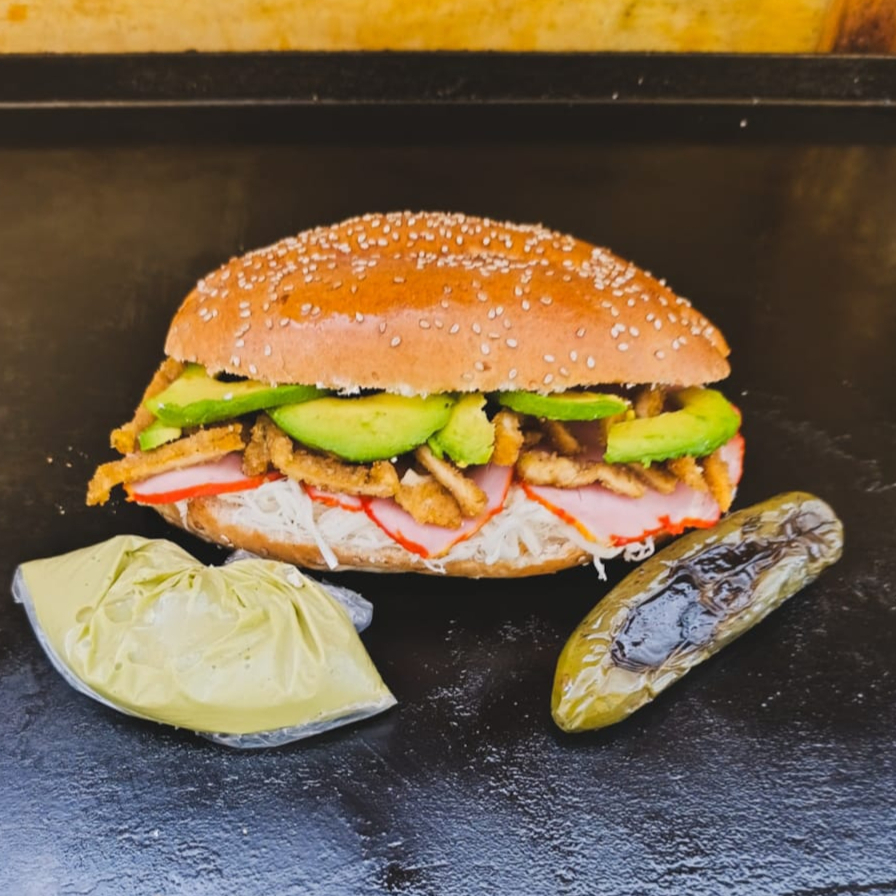 Doble textura con milanesa de pollo dorada y crujiente, Suave y jugosa pierna de cerdo, abundante queso Oaxaca fundido, cremosidad incomparable de aguacate, nuestra salsa verde artesanal para un sabor fresco, y el toque adictivo del chile toreado.