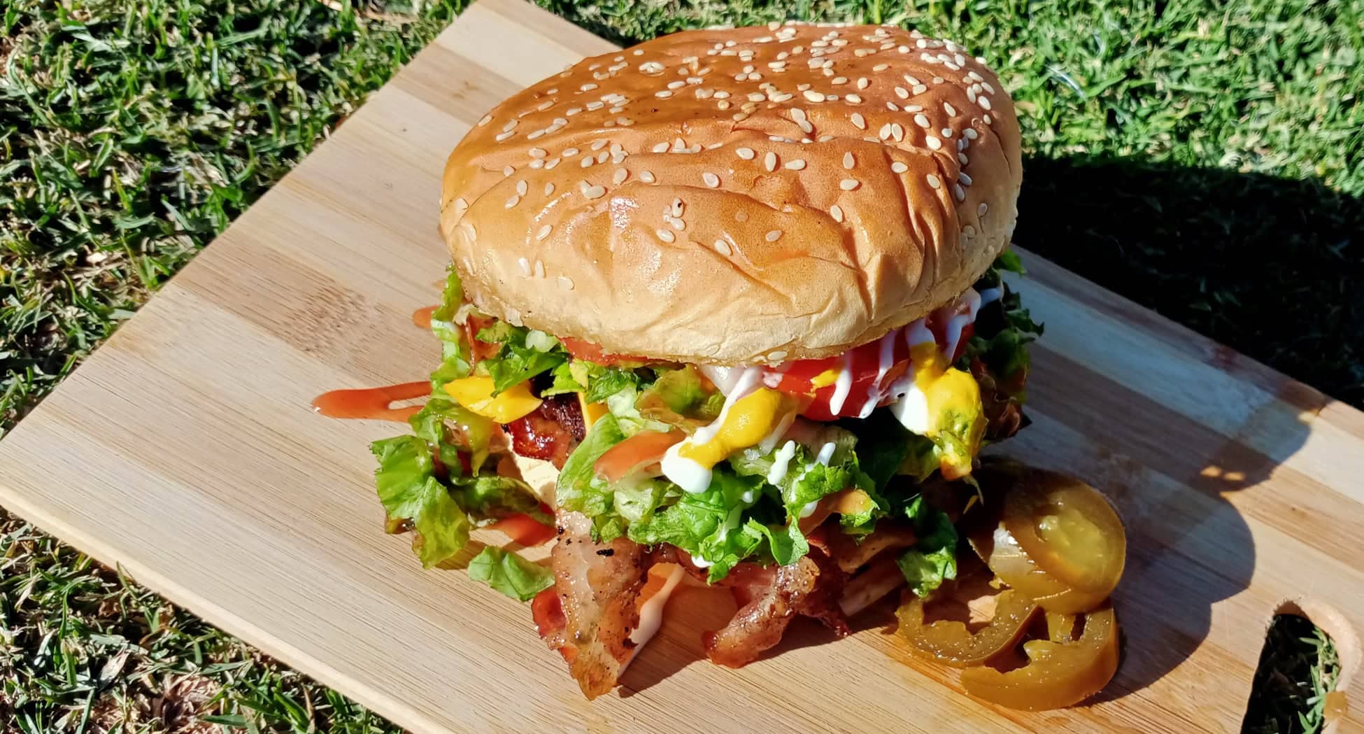 Pan grande parrillero, carne 120 gramos, queso amarillo, jamón, tocino, lechuga, jitomate, cebolla, pepinillos, aderezo