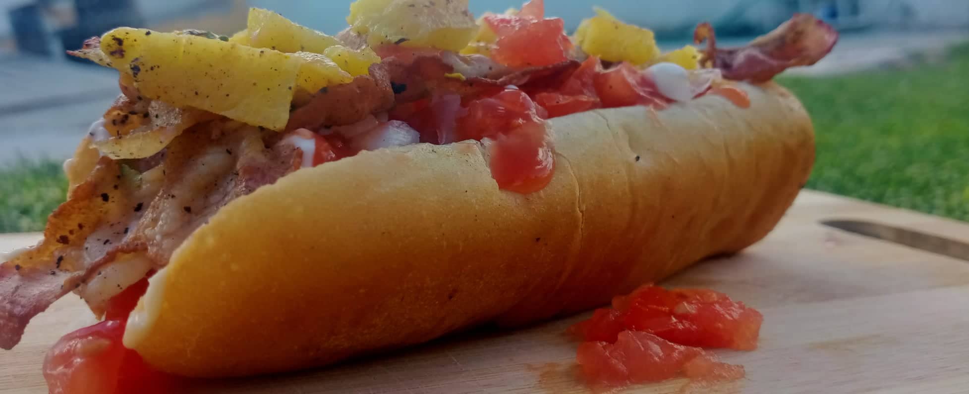 Pan Jumbo, Salchicha Jumbo, tocino, piña, jitomate, cebolla y aderezos.