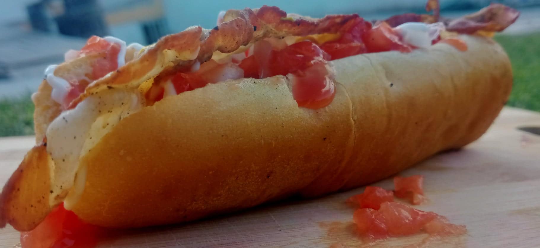 Salchicha, jitomate, tocino, cebolla y aderezos